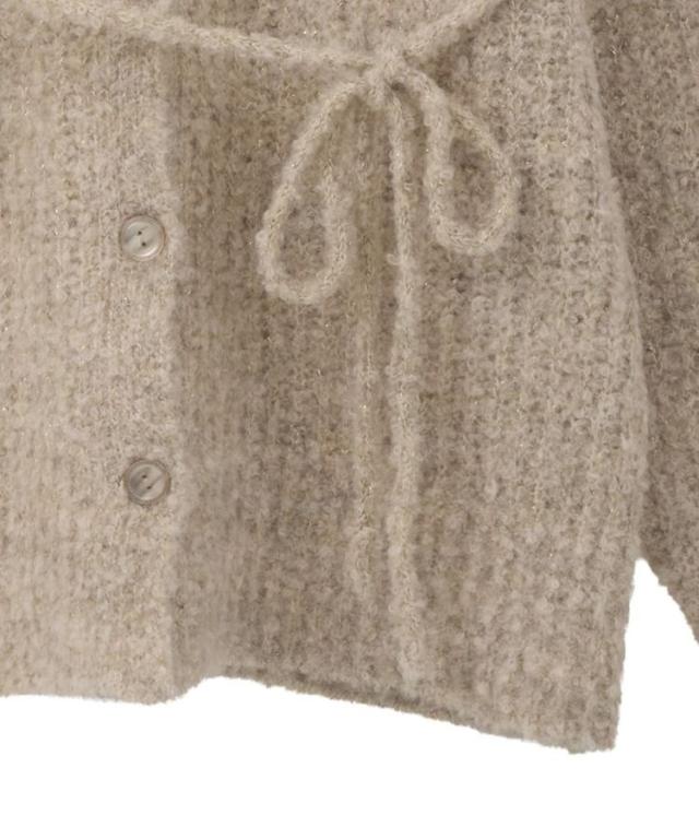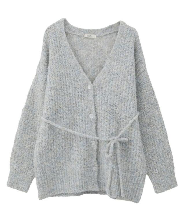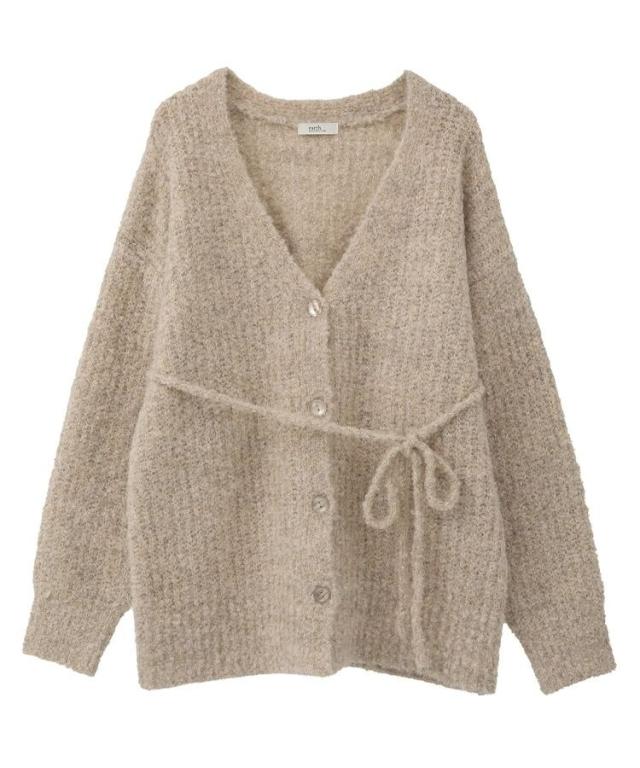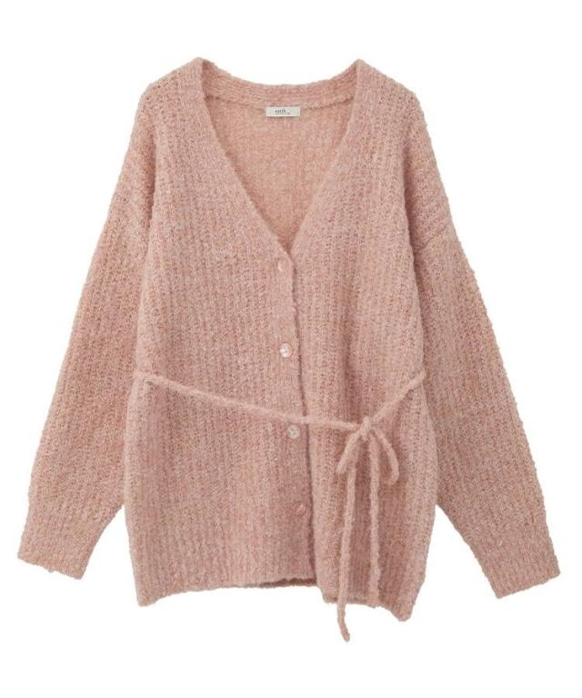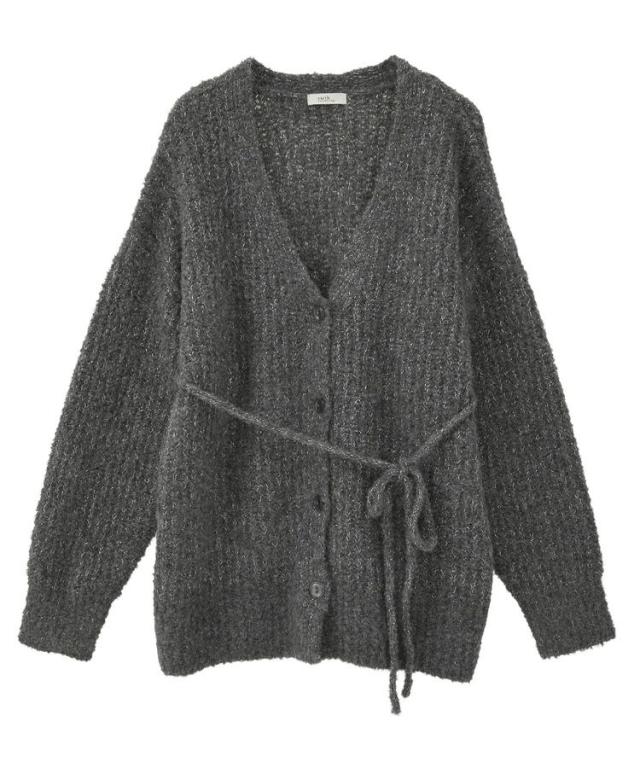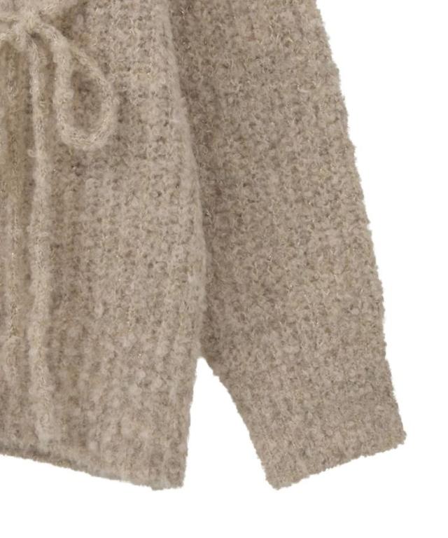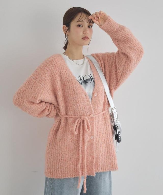 ループの凹凸感とラメ糸混合のニュアンスある配色が魅力的なブークレニットカーディガン。ゆったりとした丈感長めのラフな雰囲気がデイリースタイルにぴったりのデザインです。同糸を使用したコードベルトを付属し、ウエストマークでアレンジ出来る2WAY仕様。ボトムを選ばず様々なアイテムと合わせていただける着回しやすい1着です。