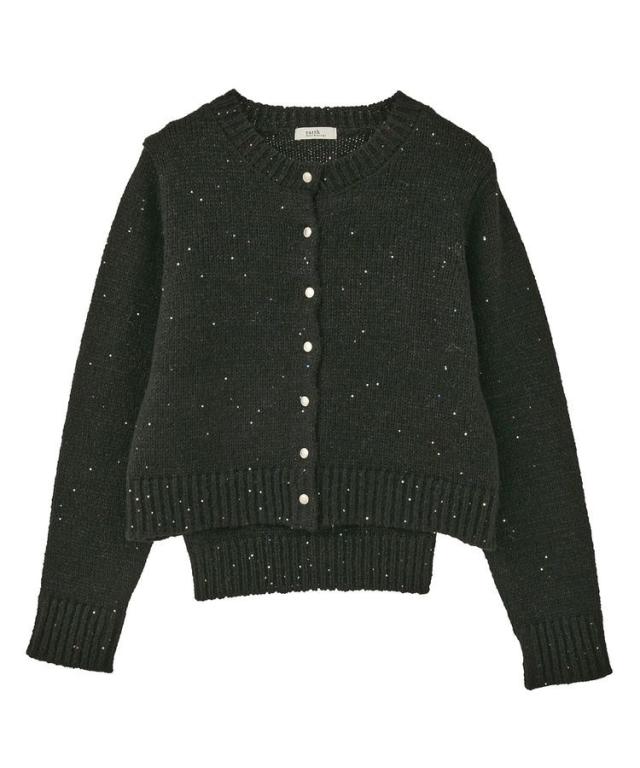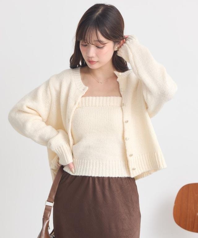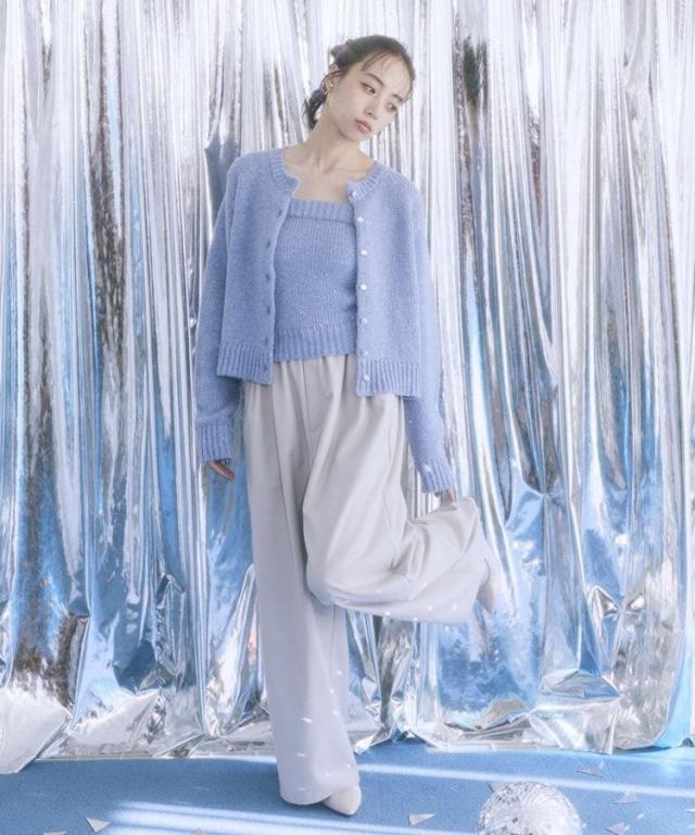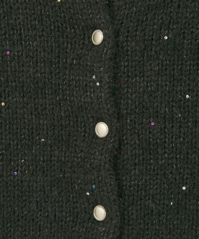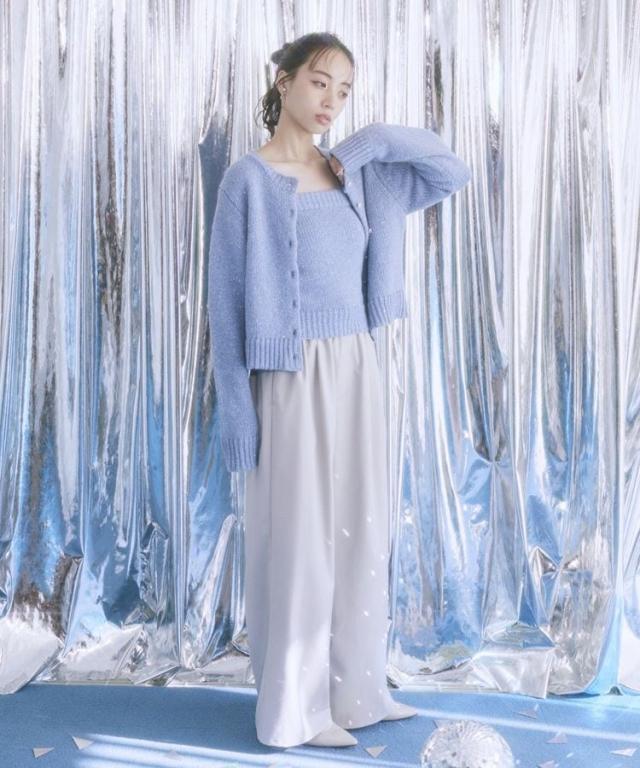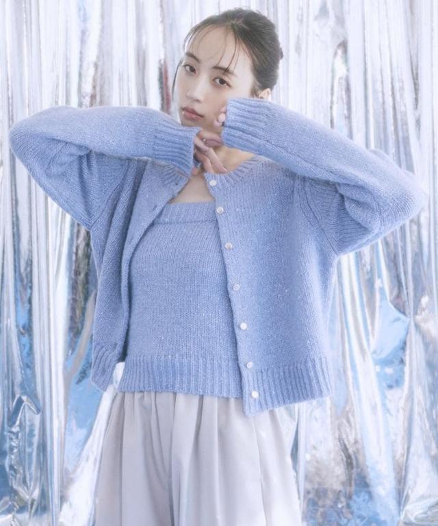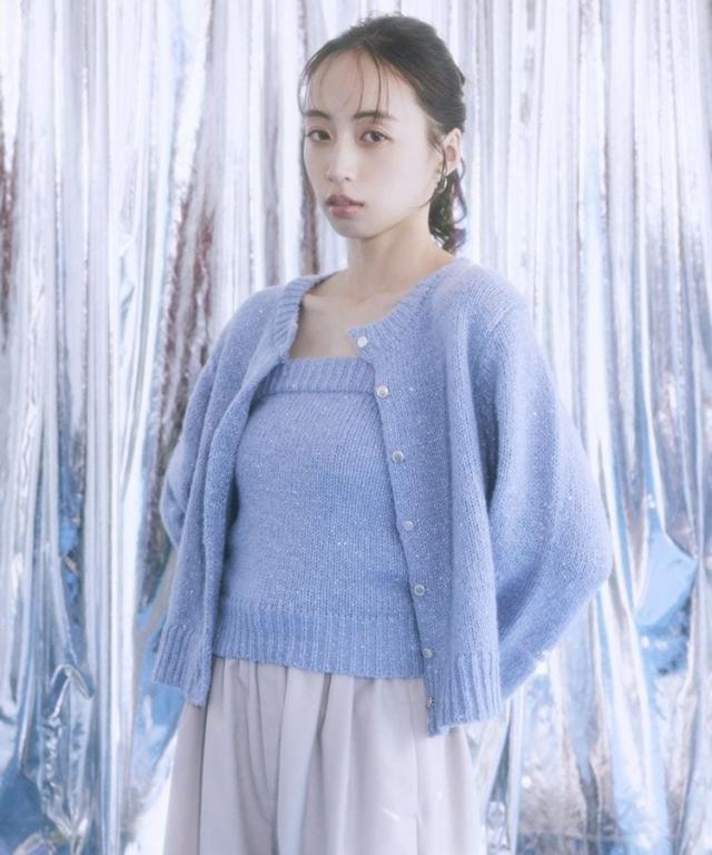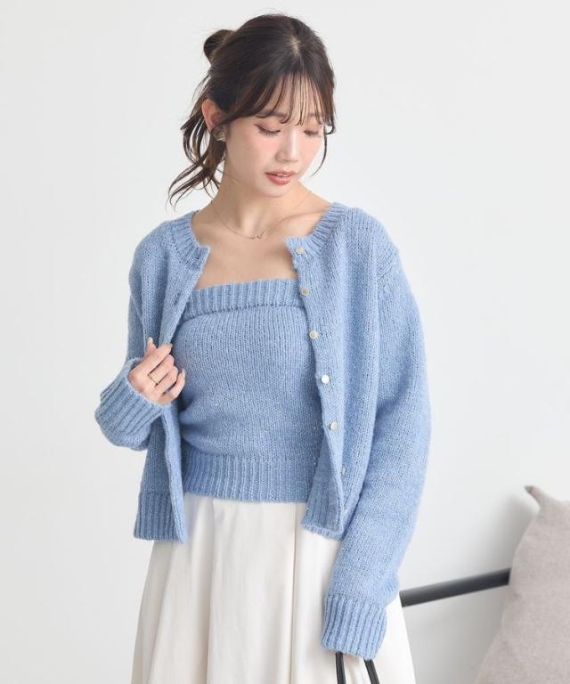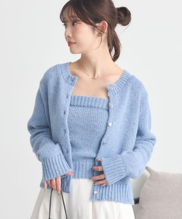 小さなフラワースパンコールがキラリと光るラメニットカーディガン。華奢なビスチェトップをセットにしたフェミニンなコンビネーションが魅力です。クラシカルなメタル風ボタンを合わせた品のある雰囲気もおしゃれなポイント。こなれ感あるスクエアフォルムでボトム合わせしやすく、それぞれ単体でも活躍してくれる使い勝手の良いアイテムです。透け感[ややあり]