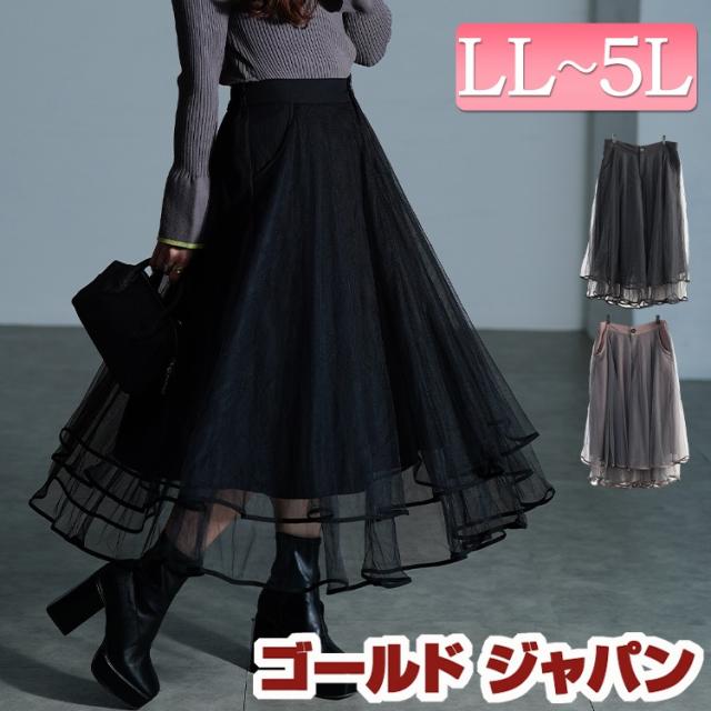 冬新作 大きいサイズ レディース スカート ボトムス ティアードチュールレイヤードスカート ロングスカート チュールスカート ロング チュール フレア ティアード ポケット ウエストゴム ゆったり 秋服 冬服 春服 夏服 LL 2L 3L 4L 5L ブラック 黒 グレー ゴールドジャパン