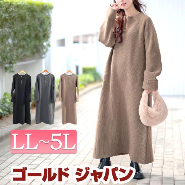 春新作 大きいサイズ レディース ワンピース ハーフZIP畦編みニットワンピース ワンピ ロングワンピース ニットワンピース ロング ニット 長袖 ハーフジップ ジップ 畦編み ストレッチ ゆったり 秋服 冬服 春 LL 2L 3L 4L 5L ブラック 黒 チャコール モカ ゴールドジャパン