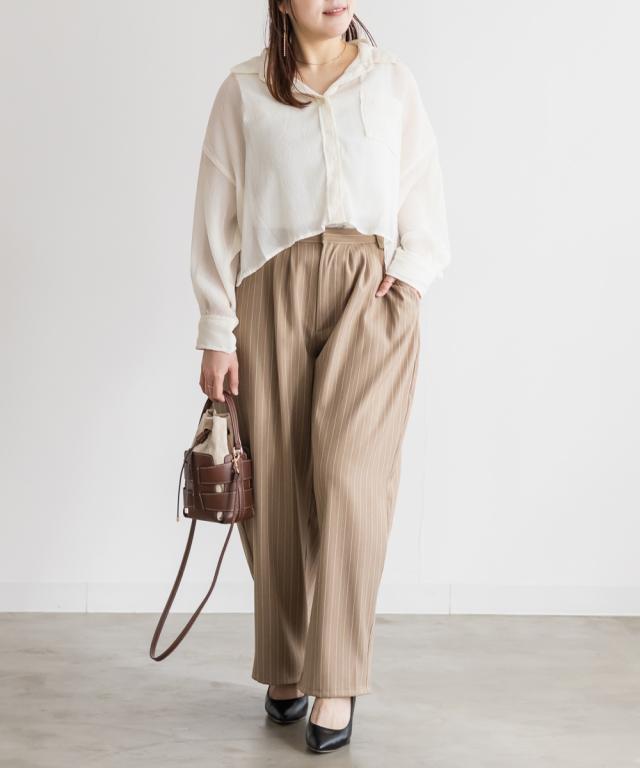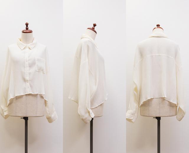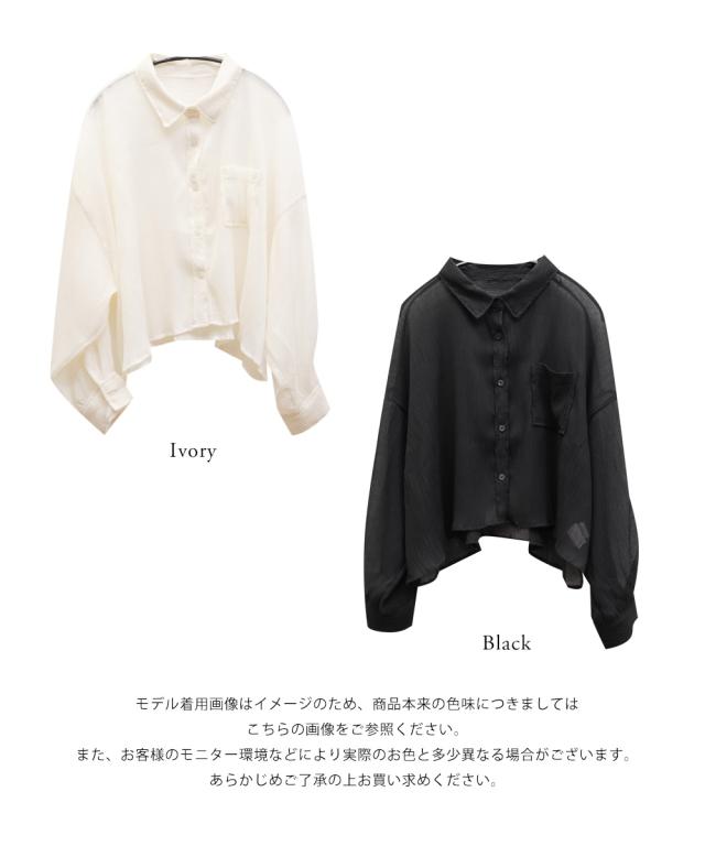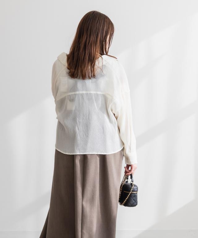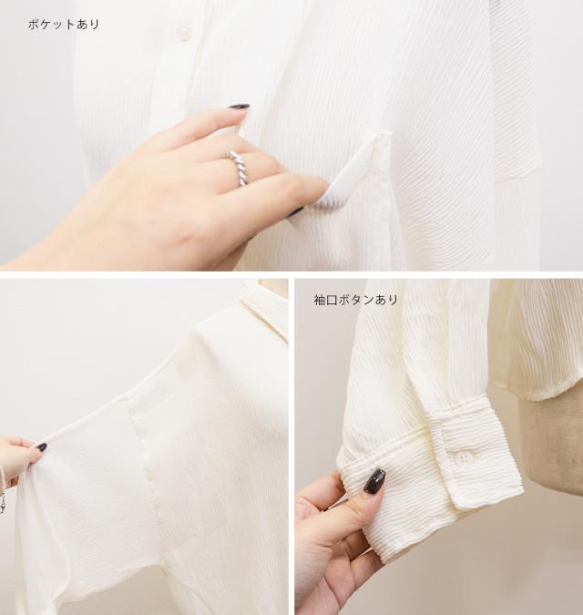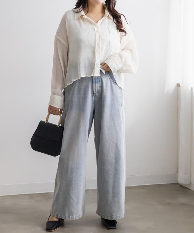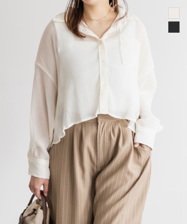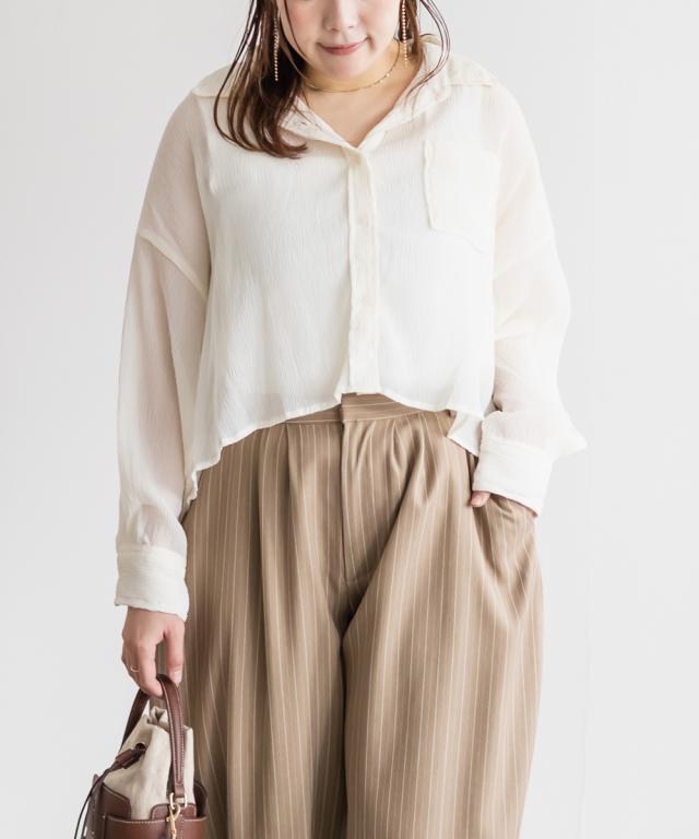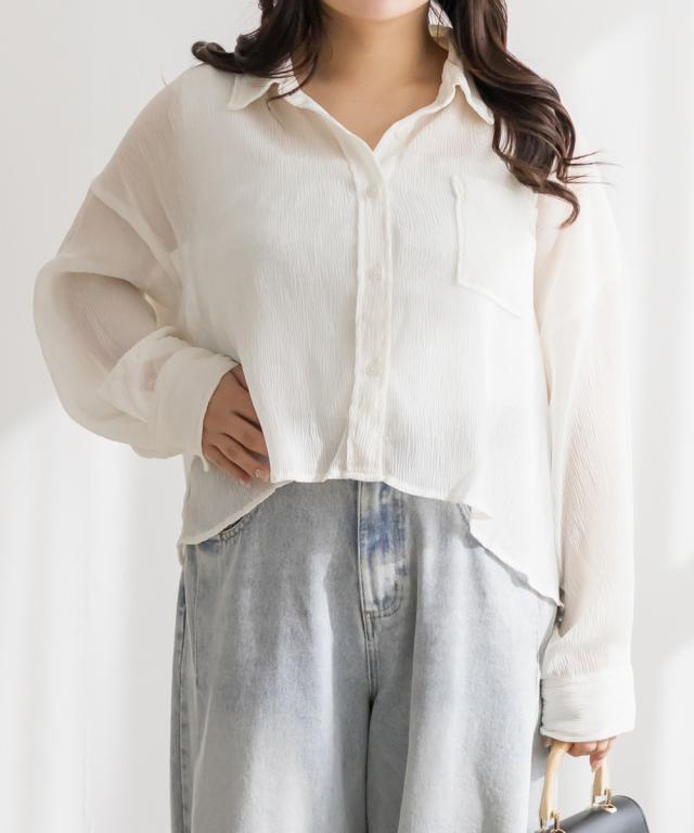 | 3Lサイズを着用しました。さらっとしてて軽やかな着心地です!透け感が可愛いシアー素材で、少し楊柳っぽい凹凸の生地がかわいいです◎シアーの素材が上品で、カジュアルにもきれいめにも合わせやすい万能アイテムです。短丈なので、アウトしてちょうどよくスタイルアップして見えました!オールシーズン使いまわせるシャツはバリエーション違いでもっておきたいアイテムです♪ |