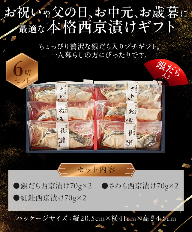| 内容量 | 【銀だら西京漬け】70g×2袋 【さわら西京漬け】70g×2袋 【紅鮭西京漬け】70g×2袋 |