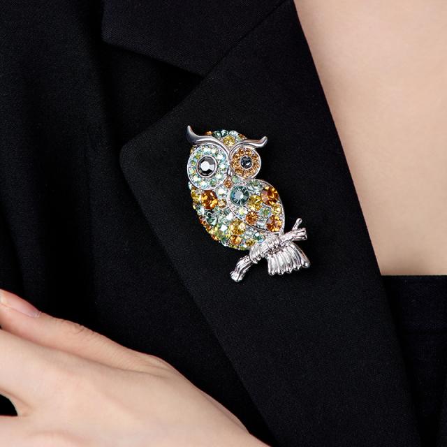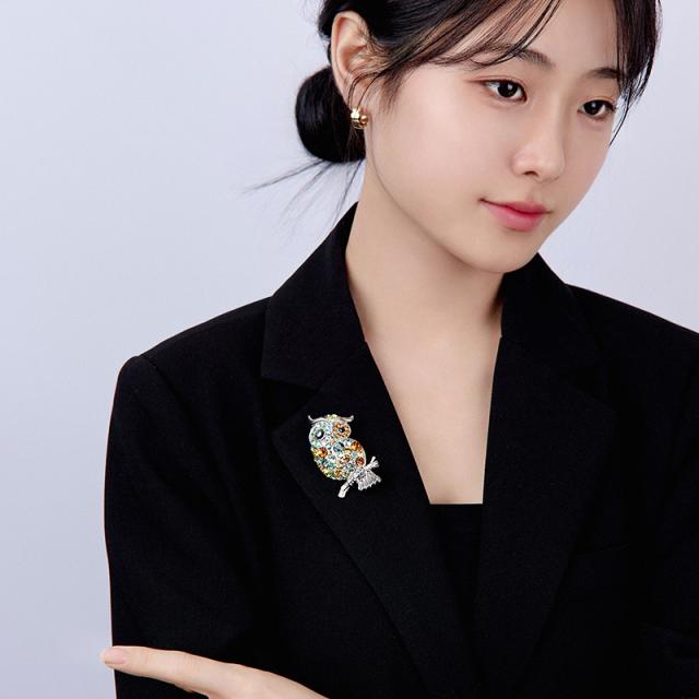 スワロフスキークリスタルが贅沢に散りばめられた、アーティスティックなフクロウモチーフのブローチ。