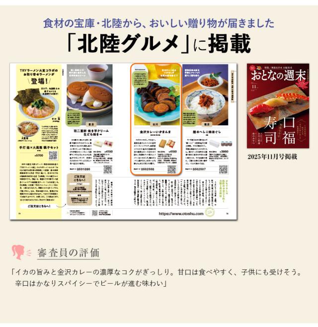 ただのいかめし、ではない。能登名産のスルメイカと金沢カレーのハイブリッド。加賀産コシヒカリと地元の老舗洋食店の濃厚なカレーを合わせて詰め、自家製ダレで煮たスパイシーないかめしだ。噛めばスパイス感が立ち、甘辛いコクも膨らむ。甘口と辛口の2種で。