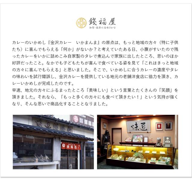 【金沢カレーいかまんま甘口】するめいか、うるち米、カレー(玉ねぎ、牛脂、小麦粉、ラード、トマトケチャップ、牛肉、練乳、醤油、香辛料、砂糖、ウスターソース、食塩)、もち米、醤油、砂糖、米発酵調味料/調味料(アミノ酸等)、カラメル色素、甘味料(甘草)、(原材料の一部に小麦・乳成分・大豆・牛肉・豚肉・りんごを含む)