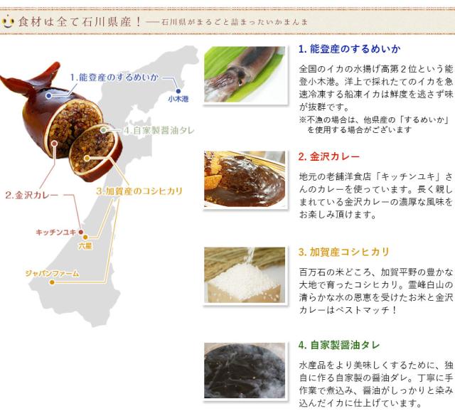【金沢カレーいかまんま辛口】するめいか、うるち米、カレー(玉ねぎ、牛脂、小麦粉、ラード、トマトケチャップ、牛肉、練乳、醤油、香辛料、砂糖、ウスターソース、食塩)、もち米、チリソース、醤油、砂糖、米発酵調味料/調味料(アミノ酸等)、カラメル色素、甘味料(甘草)、(原材料の一部に小麦・乳成分・大豆・牛肉・豚肉・りんごを含む)