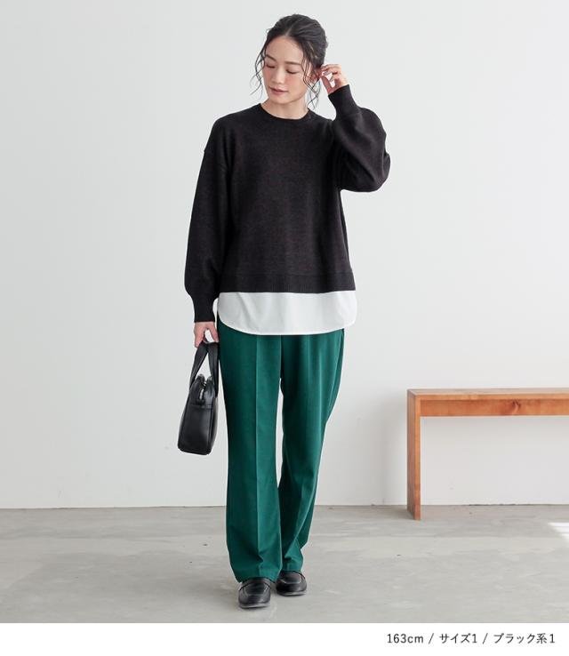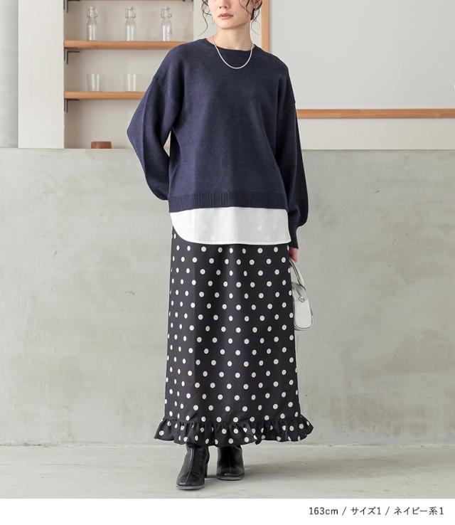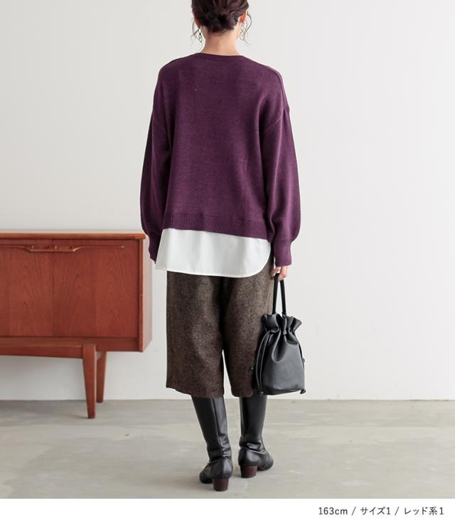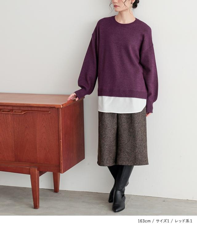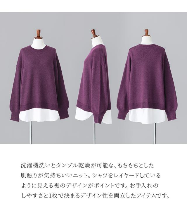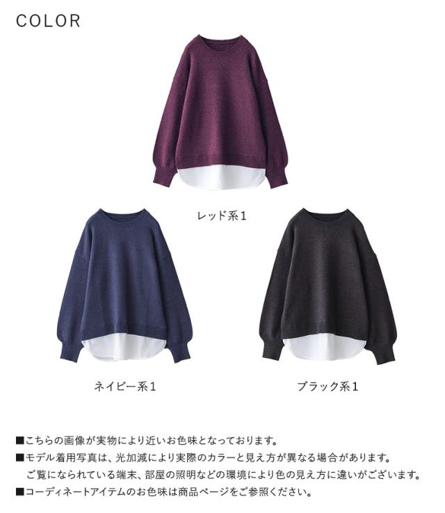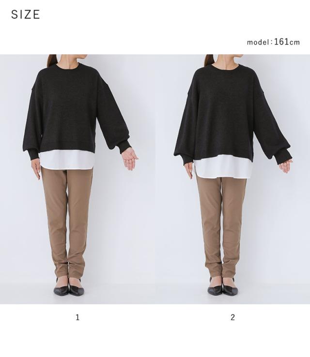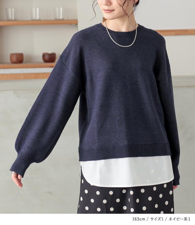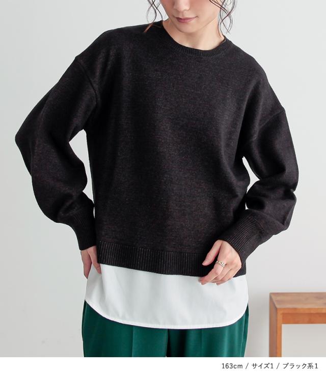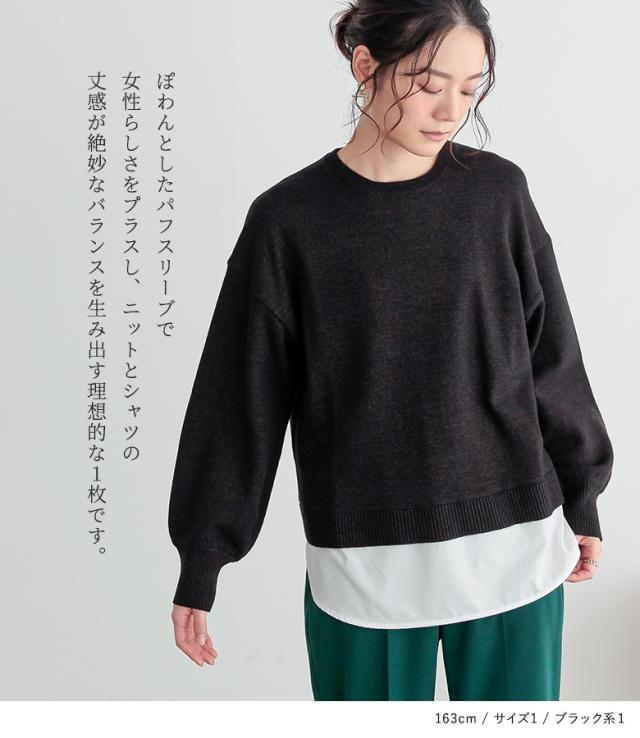 『裾レイヤード風メランジニット』【メール便不可】【20】[ニット 長袖 レディース トップス クルーネック パフスリーブ レイヤード風 重ね着 タンブル乾燥可能 メランジニット 秋 冬 ]