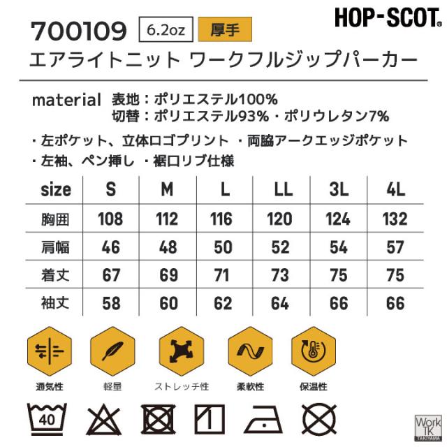 700109 HOP-SCOP エアライトニット ワークフルジップパーカー 軽量性、通気性、耐久性に優れたダンボールニット素材。 作業の邪魔にならないサイドポケットが特徴。