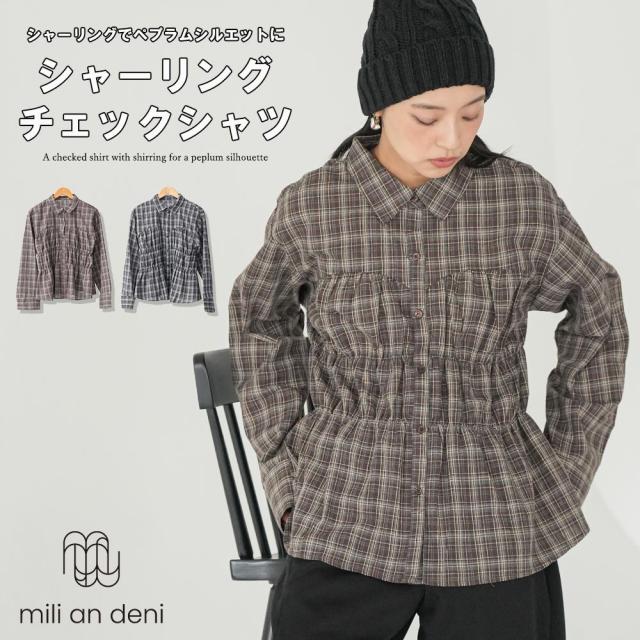 春新作 シャーリングチェックシャツ 長袖 M ペプラム フレア レディース トップス 春夏 メール便(郵2) ミリアンデニ t250534