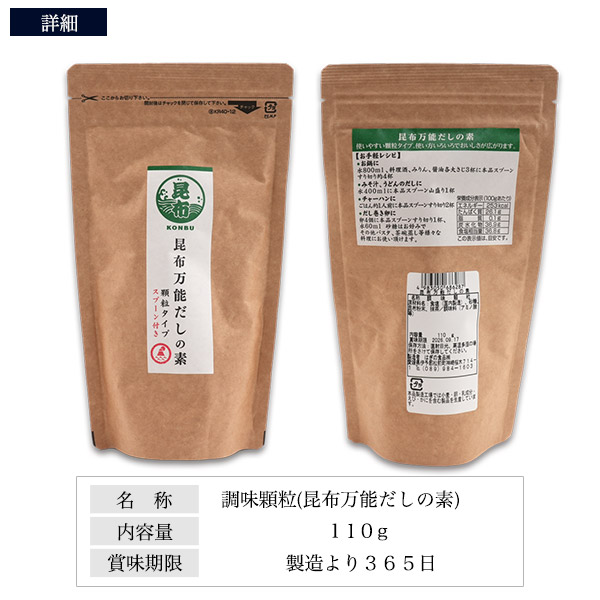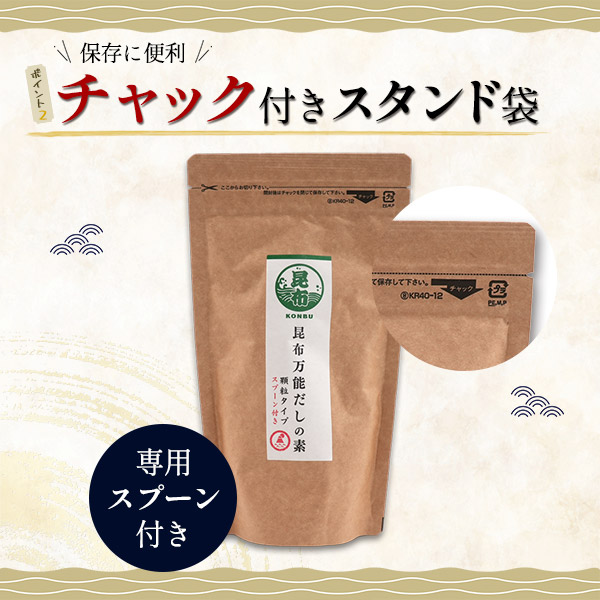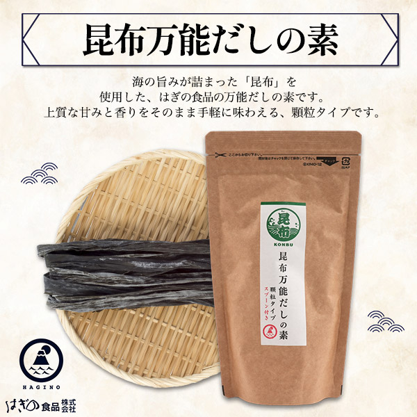 はぎの食品 昆布万能だしの素 顆粒 110g 昆布だし 保存に便利 チャック付き スタンド袋 専用スプーン付属 みそ汁 出汁巻き うどん 茶漬け 煮込み料理など 万能調味料 顆粒だし ご褒美 グルメ 和風調味料 食品 常備調味料 ポイント消化 送料無料 ダシ ポイント消化 こぶだし