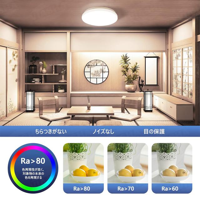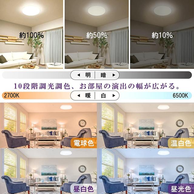 [調光・調色可能] ストロボやノイズがありません! このシーリングライトは電球色、昼白色、昼光色の3つの色温度から選べ、10%から100%の明るさに調整できるので、お好みの明るさに変えることができます。