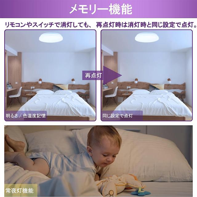 [メモリー機能付きスリープタイマー] 15分、30分、60分のタイマーオフ機能付きで、就寝時の消し忘れ防止に役立ちます。 メモリー機能付きリモコンで最後に使用した時の明るさや色温度をONにすることができます。