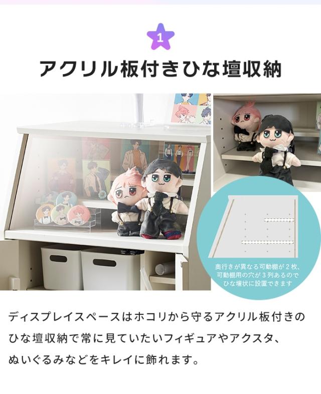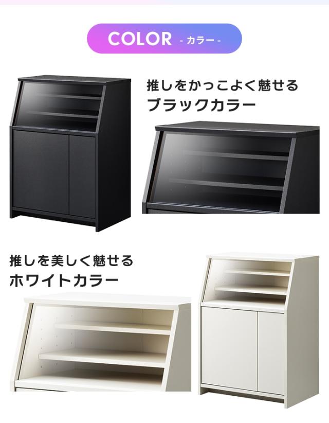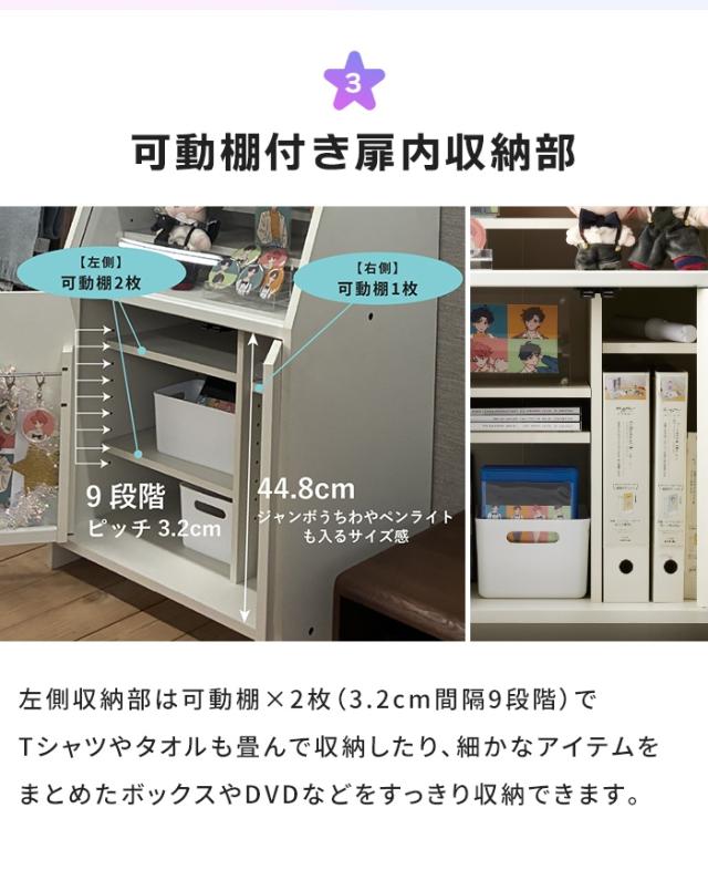 | 推しグッズをピタッと収納できるこだわり満載の推し活ラックができました。 リビングやベッドルームに自然になじみながら、推しを日常の中に溶け込ませられる収納家具です。 コレクションを際立たせるようにベーシックなブラック・ホワイトの2色展開。 <推しポイント> ◇ アクリル板付きひな壇収納 ディスプレイスペースはホコリから守るアクリル板付きのひな壇収納で常に見ていたいフィギュアやアクスタ、ぬいぐるみなどをキレイに飾れます。 奥行きの異なる可動棚(3.2cm間隔6段階)が2枚ついているので、ひな壇上に設置できます。 アクリル窓部分は推しが見やすいようには傾斜20°になっています。 ◇ 扉収納 扉内の収納部も大容量の収納スペース。 左側収納部は可動棚×2枚(3.2cm間隔9段階)でTシャツやタオルも畳んで収納したり、細かなアイテムをまとめたボックスやDVDなどをすっきり収納できます。 右側収納部はペンライトや縦長アイテムの収納に便利。 可動棚×1枚(3.2cm間隔9段階)で背の高い大きめの本やグッズも収納できます。 ◇ 扉裏にも収納機能がたっぷり 左扉内側にはバー(6.4cm間隔2段階)がついているのでジャンボうちわやキーボルダー、タオルを掛けることできます。 |