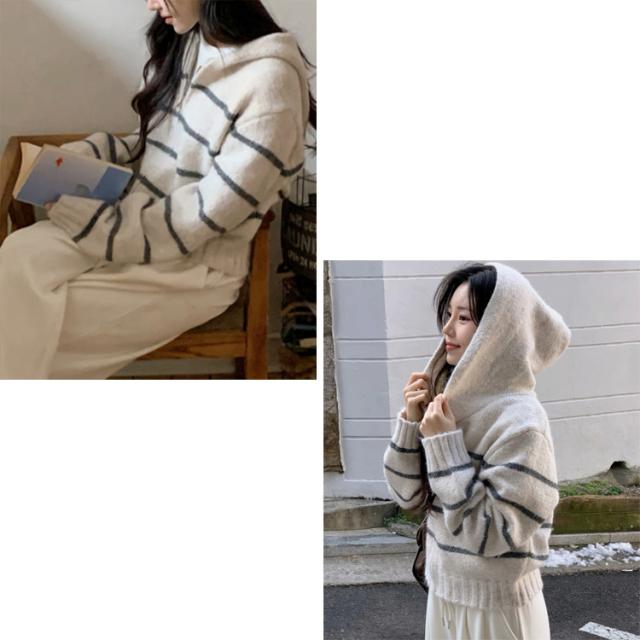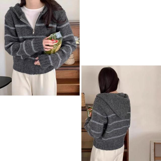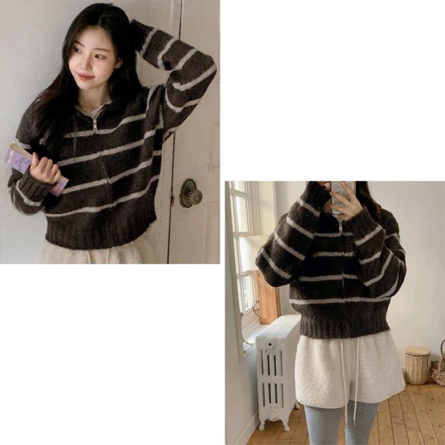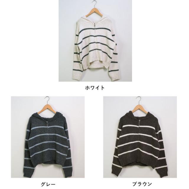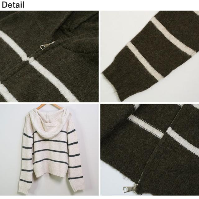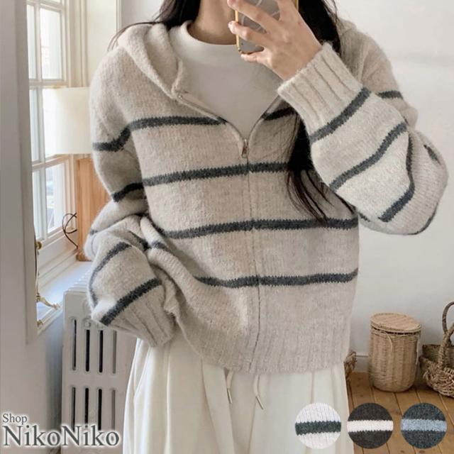 全品送料無料一部除く ボーダー ジップアップ ニットパーカー【即納】韓国ファッション 韓国カジュアル 海外ガール 部屋着 ルームウェア フーディー フード付き ニットカーデ セーター 羽織 トップス 長袖 ルーズ ルーズフィット レディース 韓国 流行り トレンド かわいい