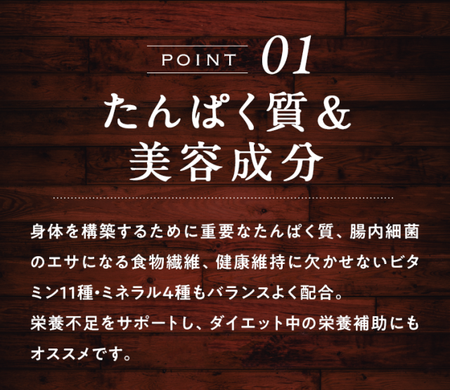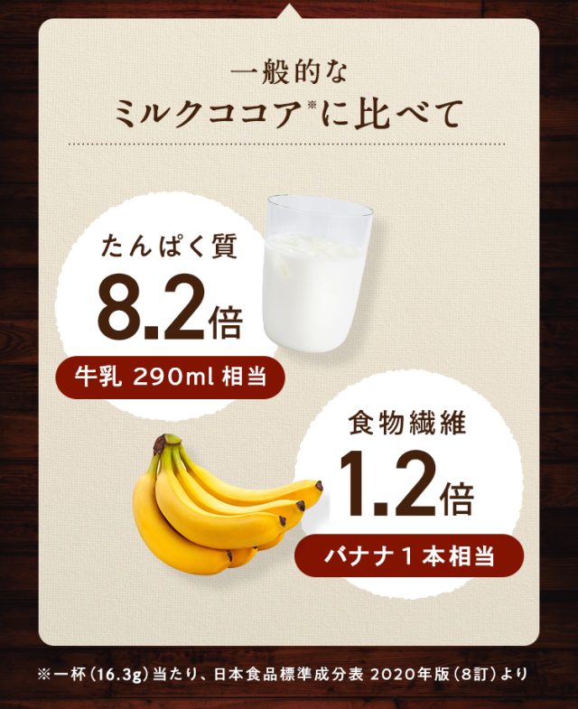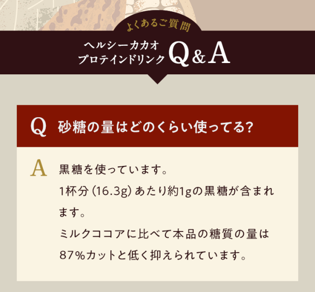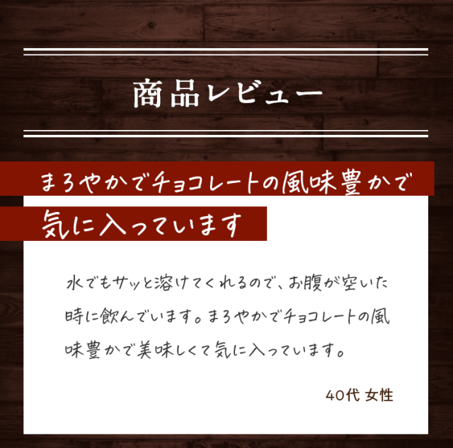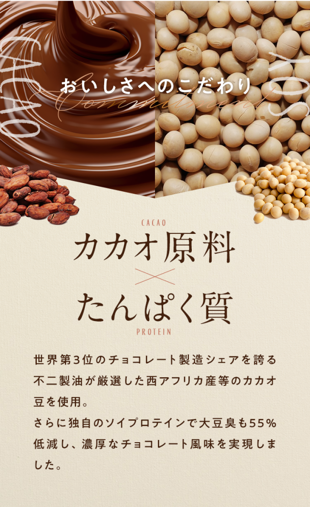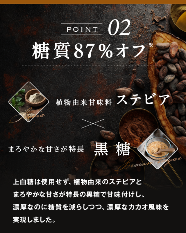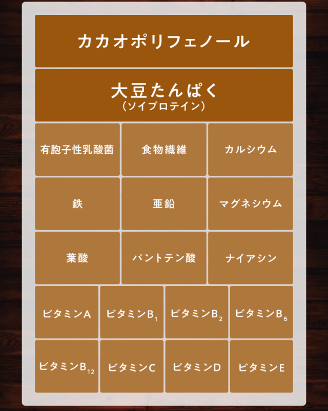 大豆たんぱく(国内製造)、ココアパウダー(ココアバター10〜12%)、黒糖、亜鉛含有酵母、有胞子性乳酸菌/香料、貝カルシウム、リン酸三カルシウム、塩化マグネシウム、酸化マグネシウム、安定剤(グァーガム)、ビタミンC、甘味料(ステビア)、クエン酸第一鉄ナトリウム、ビタミンE、ナイアシン、パントテン酸カルシウム、ビタミンB1、ビタミンB6、ビタミンB2、ビタミンA、葉酸、ビタミンD、ビタミンB12