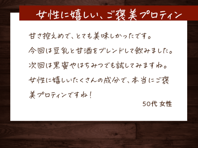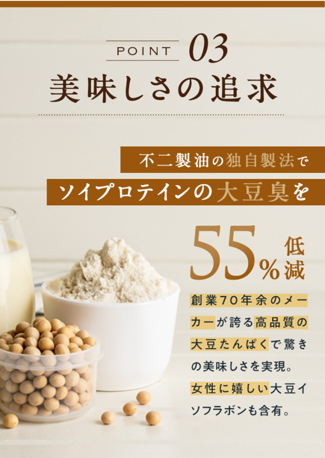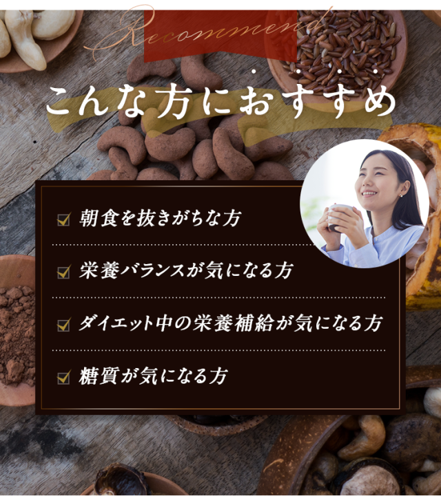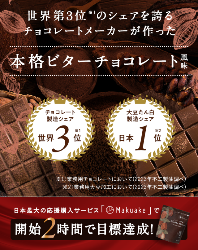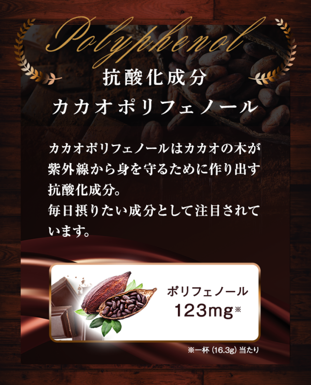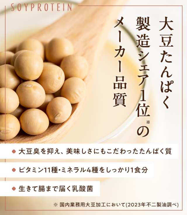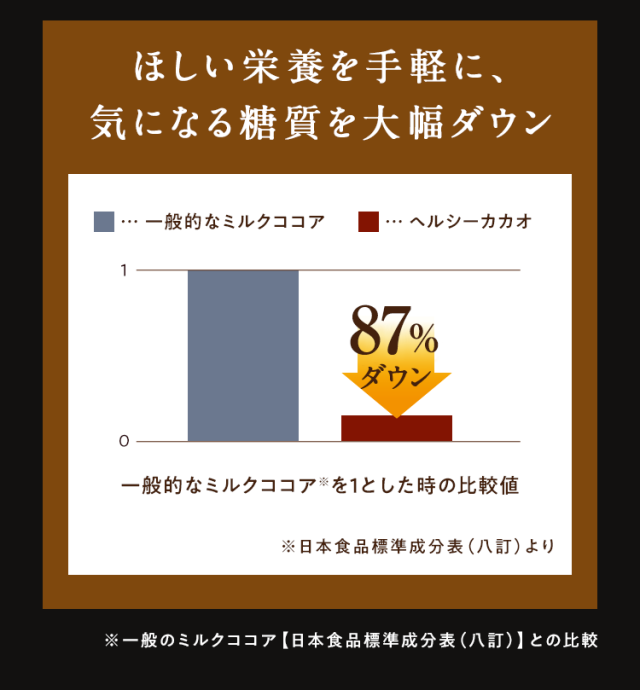 大豆たんぱく(国内製造)、ココアパウダー(ココアバター10〜12%)、黒糖、亜鉛含有酵母、有胞子性乳酸菌/香料、貝カルシウム、リン酸三カルシウム、塩化マグネシウム、酸化マグネシウム、安定剤(グァーガム)、ビタミンC、甘味料(ステビア)、クエン酸第一鉄ナトリウム、ビタミンE、ナイアシン、パントテン酸カルシウム、ビタミンB1、ビタミンB6、ビタミンB2、ビタミンA、葉酸、ビタミンD、ビタミンB12