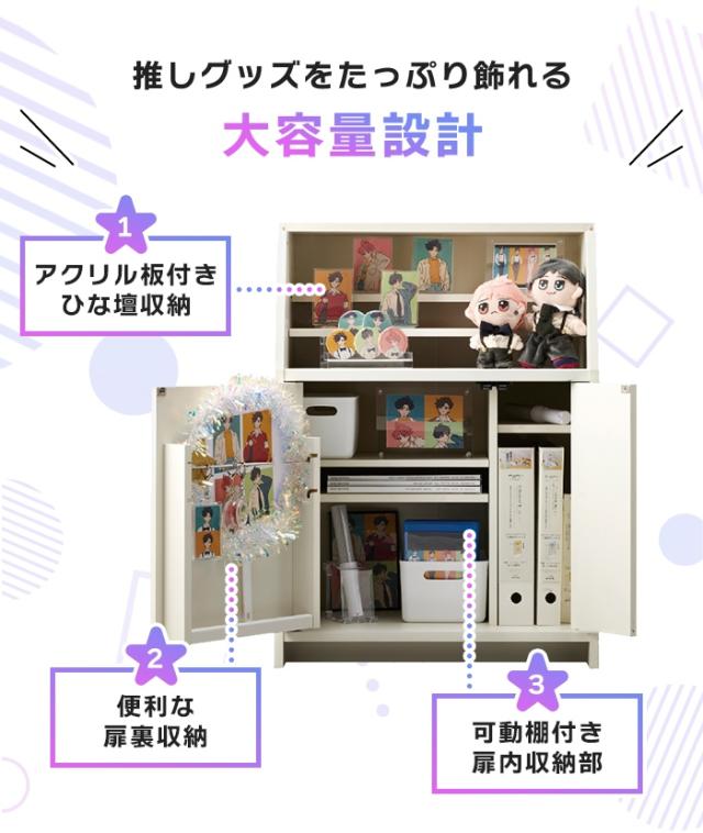 | 推しグッズをピタッと収納できるこだわり満載の推し活ラックができました。 リビングやベッドルームに自然になじみながら、推しを日常の中に溶け込ませられる収納家具です。 コレクションを際立たせるようにベーシックなブラック・ホワイトの2色展開。 <推しポイント> ◇ アクリル板付きひな壇収納 ディスプレイスペースはホコリから守るアクリル板付きのひな壇収納で常に見ていたいフィギュアやアクスタ、ぬいぐるみなどをキレイに飾れます。 奥行きの異なる可動棚(3.2cm間隔6段階)が2枚ついているので、ひな壇上に設置できます。 アクリル窓部分は推しが見やすいようには傾斜20°になっています。 ◇ 扉収納 扉内の収納部も大容量の収納スペース。 左側収納部は可動棚×2枚(3.2cm間隔9段階)でTシャツやタオルも畳んで収納したり、細かなアイテムをまとめたボックスやDVDなどをすっきり収納できます。 右側収納部はペンライトや縦長アイテムの収納に便利。 可動棚×1枚(3.2cm間隔9段階)で背の高い大きめの本やグッズも収納できます。 ◇ 扉裏にも収納機能がたっぷり 左扉内側にはバー(6.4cm間隔2段階)がついているのでジャンボうちわやキーボルダー、タオルを掛けることできます。 |