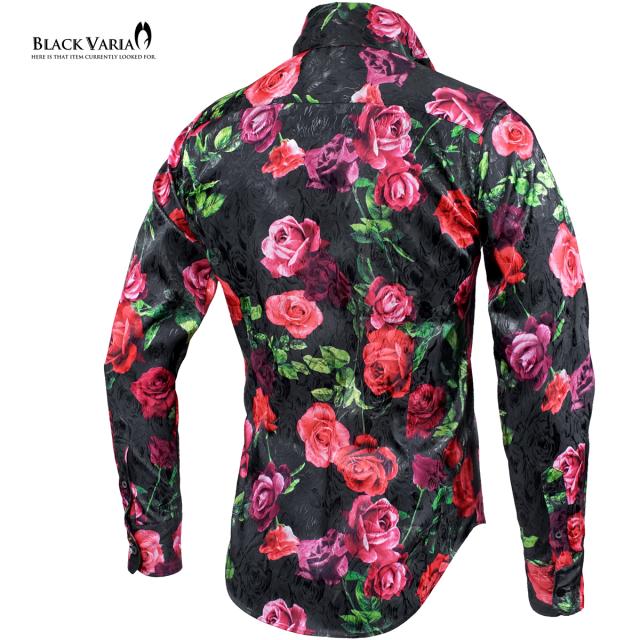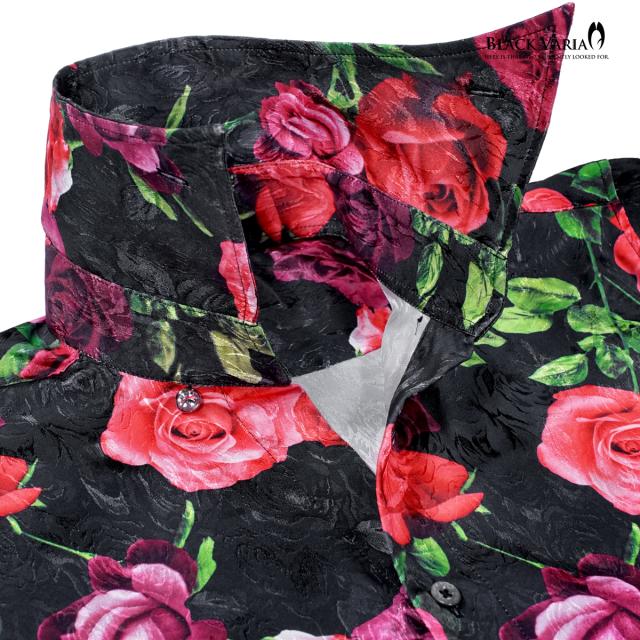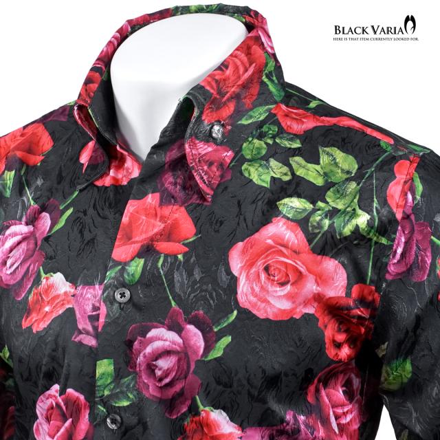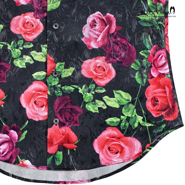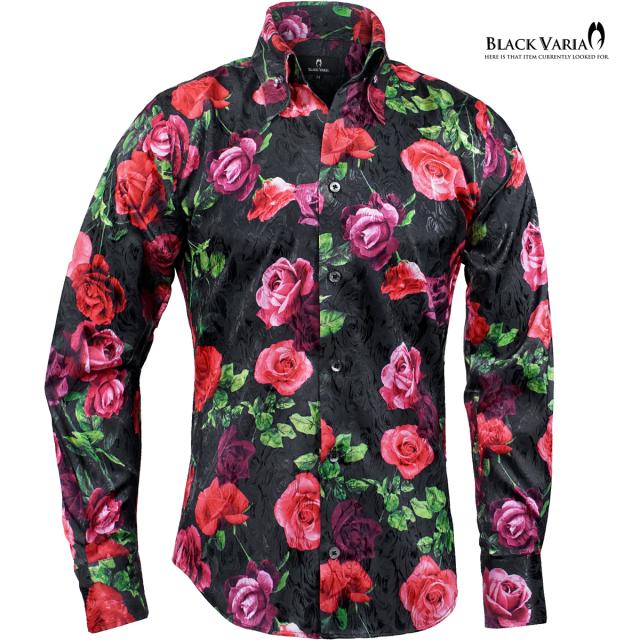 BLACK VARIA ブラックバリア サテンシャツ ドレスシャツ スキッパー 薔薇柄 ボタニカル ジャガード ボタンダウン(ブラック黒) 251105