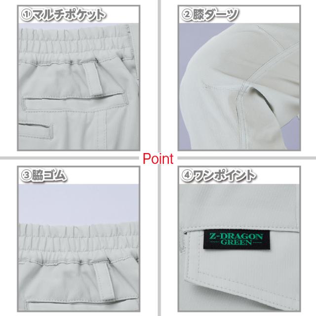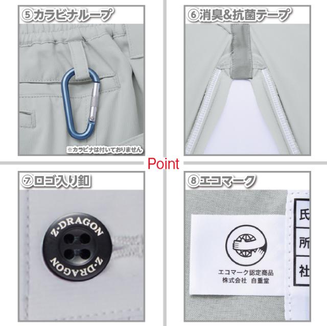 ◇マルチポケット・膝ダーツ・脇ゴム・ワンポイント・カラビナループ・消臭と抗菌テープ・エコマーク・ロゴ入り釦(帯先)