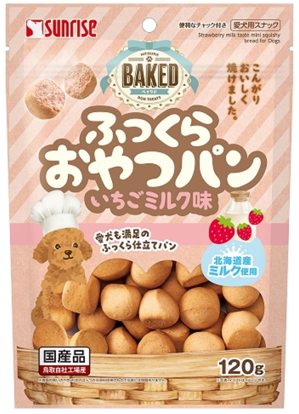 こんがりおいしく焼き上げた香ばしい風味といちごミルクの味わいが楽しめるワンちゃん専用のおやつパンです。やわらか食感のひとくちサイズなのでかたいものが苦手な小型犬やシニア犬にも安心して与えられます。