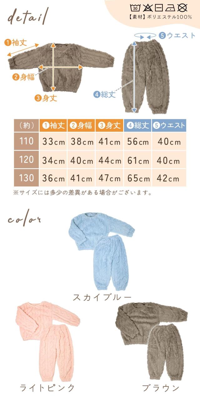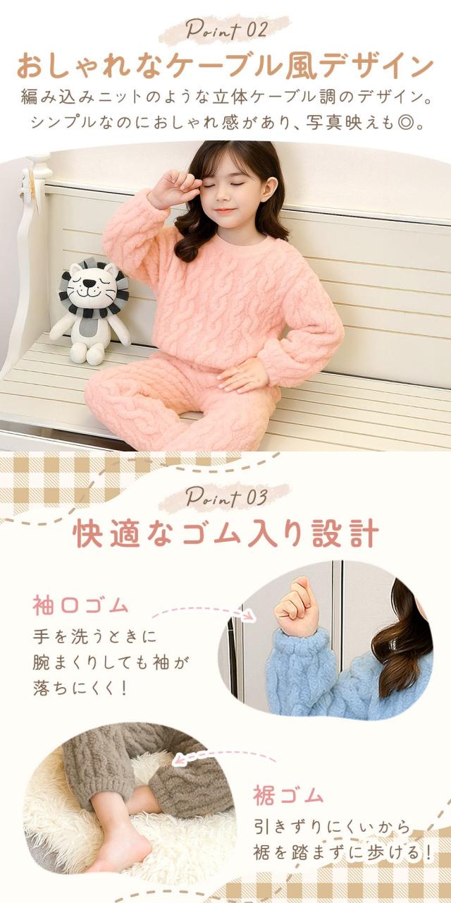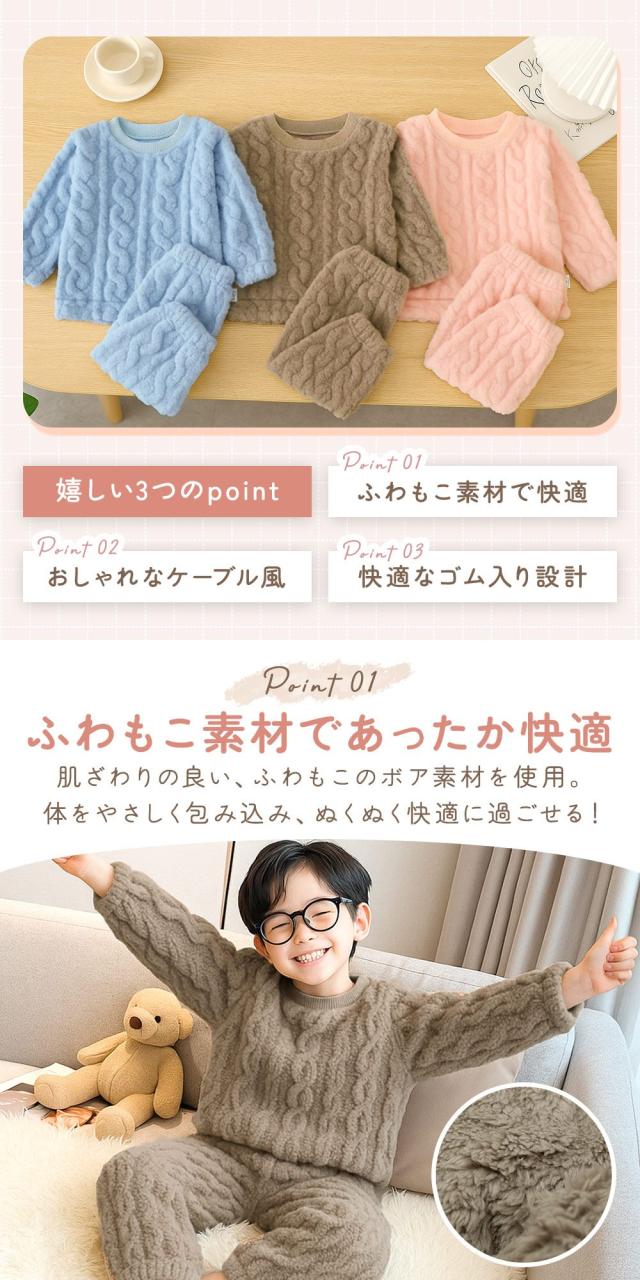 【MILASIC公式】 キッズパジャマ 2点セット 上下 冬用 セットアップ もこもこ パジャマ トップス ふわもこ あったか ボトムス ルームウェア 袖口 裾 ゴム入り ウエストゴム ストレッチ 無地 ケーブル風 長袖 男の子 女の子 子供服 かわいい 上下セット 110 120 130 おしゃれ