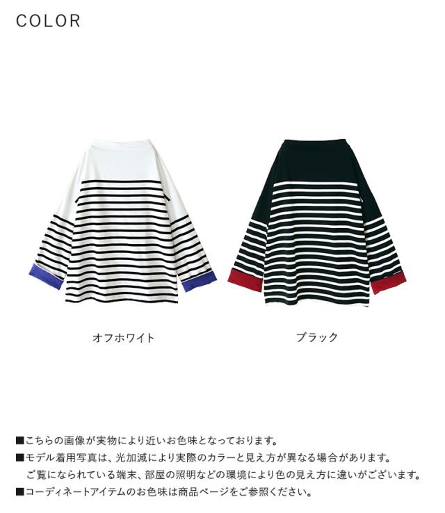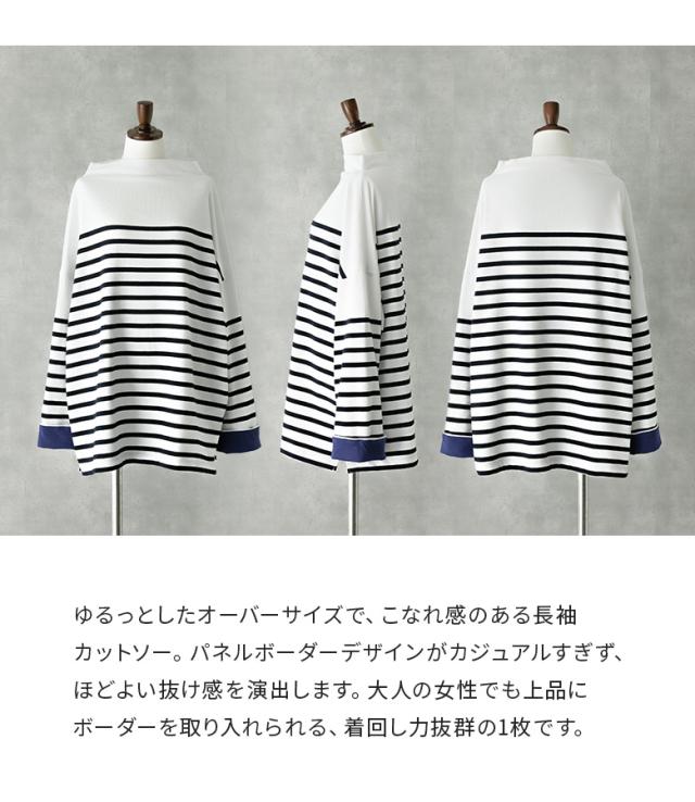 <秋新作>『ボトルネックパネルボーダーカットソー』※メール便可※【10】[カットソー 長袖 レディース トップス ロンT ボーダー柄 パネルボーダー ボトルネック 配色 綿100% オーバーサイズ 秋 冬 春]