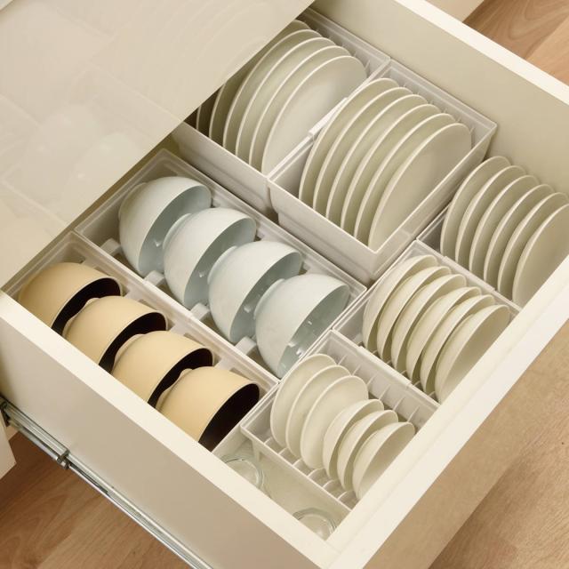 引き出しの中に食器の定位置を作り、美しく収納できます。どこに何があるか引き出しを開けたときに分かりやすく、出した食器をどこに戻すかも一目瞭然です。また、シンクやコンロ下の低い位置に立てて収納することで、お皿が崩れたり落下してしまう事を防ぎ、地震対策になります。