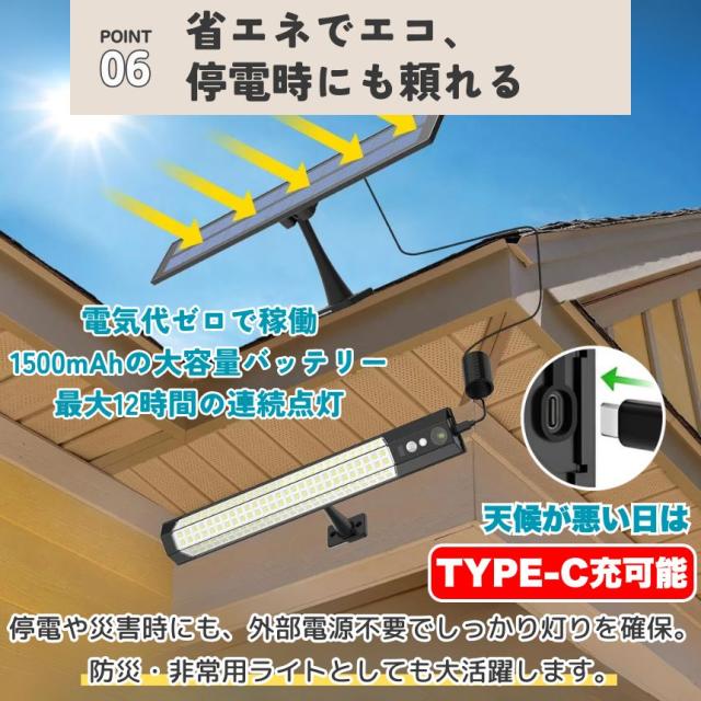 電気代ゼロの**太陽光充電式(1500mAhリチウム電池内蔵)**で、