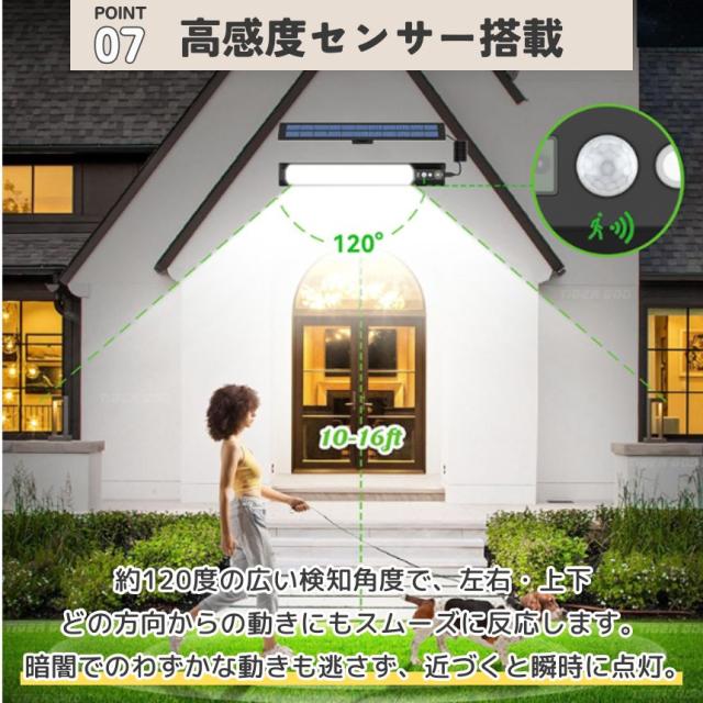 人の動きを広範囲にキャッチして自動点灯し、不審者の侵入を未然に防ぎます。