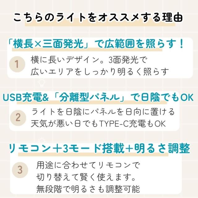 パネルは日当たりの良い場所に、ライトは好きな位置に設置可能です。