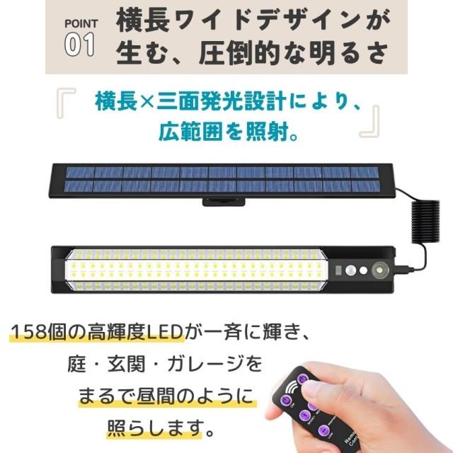 また、高輝度158個LEDチップを搭載し、3面発光で照射範囲は圧倒的。
