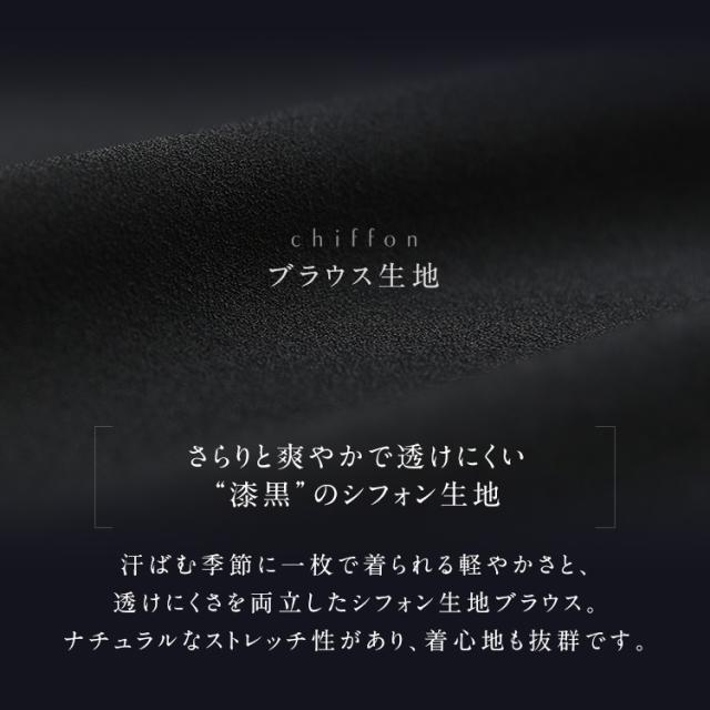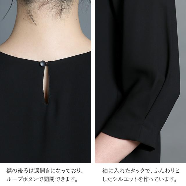 襟元に入った二箇所のタックが美しいドレープ感を作ります。長さの異なるシフォン生地を二枚重ねています。襟の後ろは涙開きになっており、ループボタンで開閉できます。