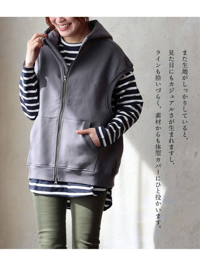 ベスト レディース 着痩せ ワイド ジップアップ パーカー 暖かい 裏起毛 綿100 USAコットン しっかり 丈夫 重ね着 ハイネック ポケット おしゃれ ゆったり 大きいサイズ 無地 ロゴ 刺繍 ダブルジップ ポケット お尻 体型 カバー 大人 カジュアル パティ
