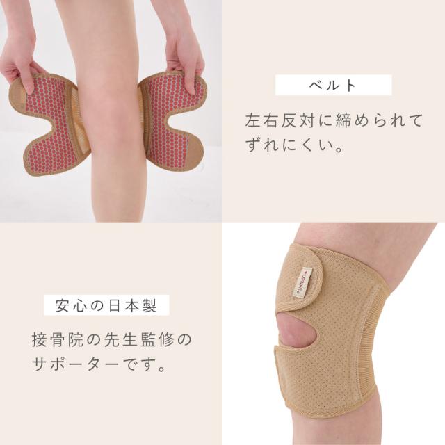 左右に内蔵されている2本のスパイラルボーンが膝関節をサポート。膝の曲げ伸ばしを助け屈伸が楽になります。ガクっとくる膝でお悩みの方にもおすすめ。上下のベルトは左右反対方向に締められるのでずれにくい設計です。