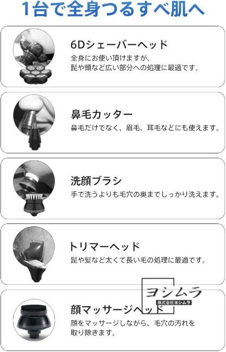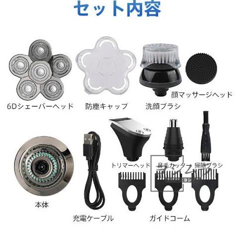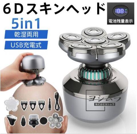 6Dスキンヘッド 乾湿両用 トリマー 5in1 髭剃り スキンヘッド メンズ 電動シェーバー 電動バリカン 髪剃り 防水 鼻毛カッター 洗顔ブラシ