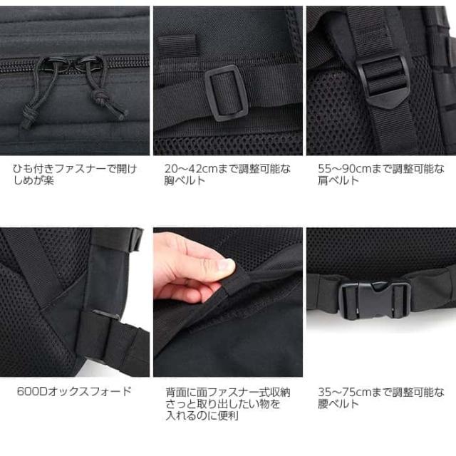 ● MOLLEシステム対応で、拡張性はバツグン!モール対応ポーチなどのアクセサリーパーツ、ペットボトルホルダー、眼鏡、トランシーバー、カラビナなどが掛けることができ、目的や好みに合わせて拡張できます。