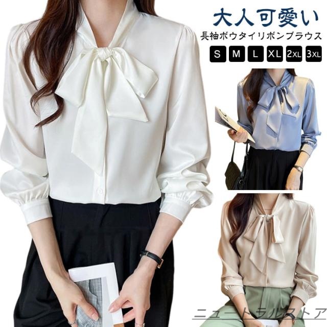 ブラウス ボウタイ リボン シャツ レディース 長袖 トップス 春 秋 リボンタイ カフス おしゃれ きれいめ かわいい 通勤 オフィス 30代 40代 50代 シャツブラウス オフィスカジュアル とろみ生地 薄手 無地 シンプル 大人可愛い 上品 OL フェミニン 卒業式 入学式