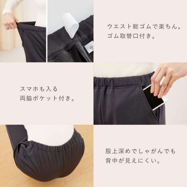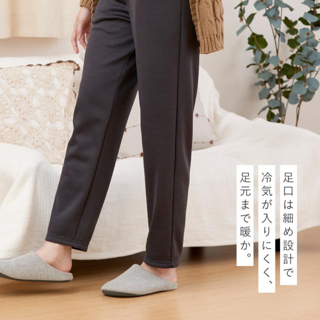 ゆったりヒップ&すっきりテーパードで、きれい見え&快適。足口は細め設計で冷気が入りにくく、足元まであたたか。のびのびストレッチで屈伸もスムーズ。