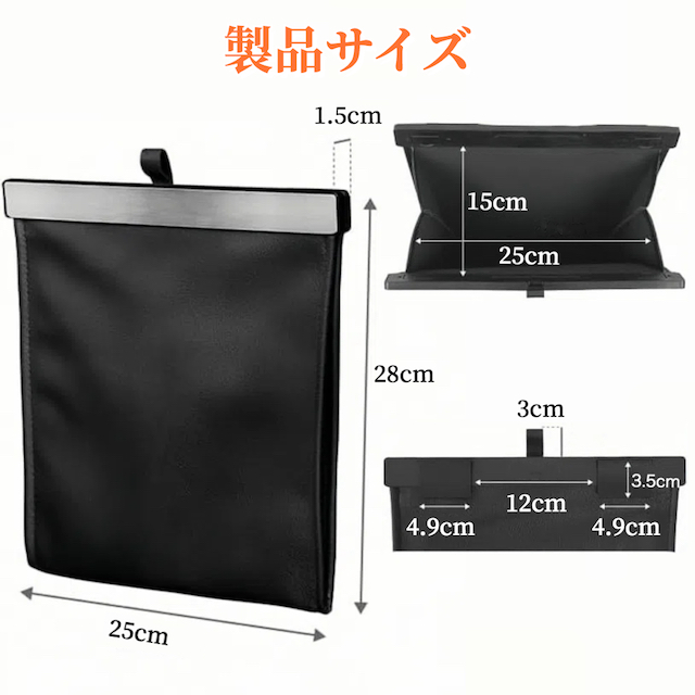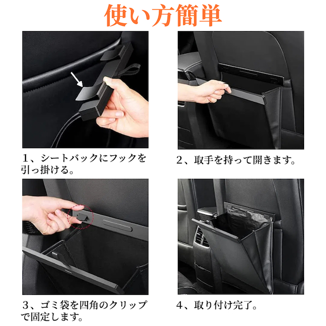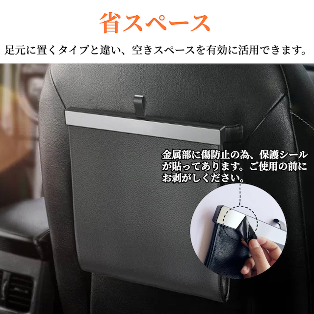 背面クリップ式なので。外側のフックで引っ掛けるだけで簡単取り付け。大容量なので散らかりがちな車内もスッキリ片付きます。足元に置くタイプのゴミ箱よりスペースを有効に活用できます。