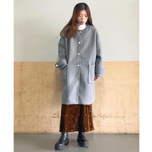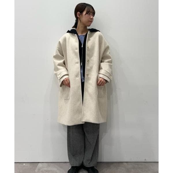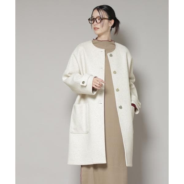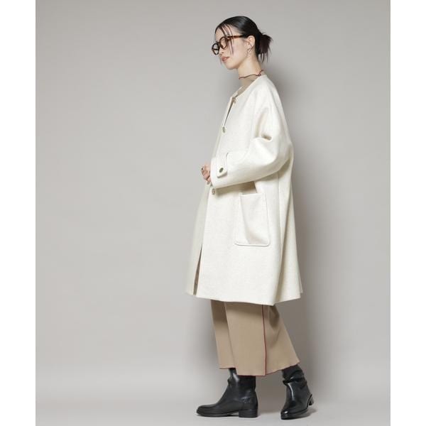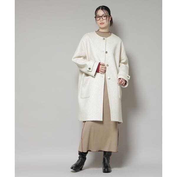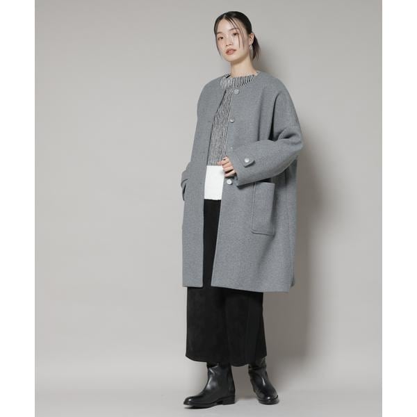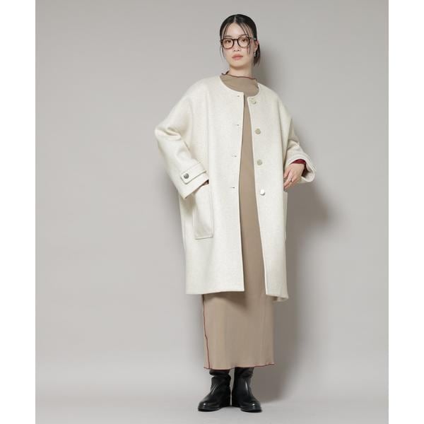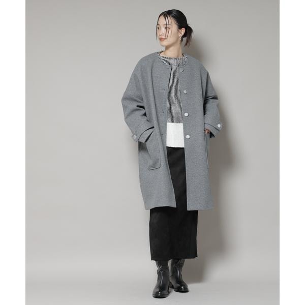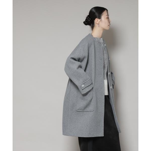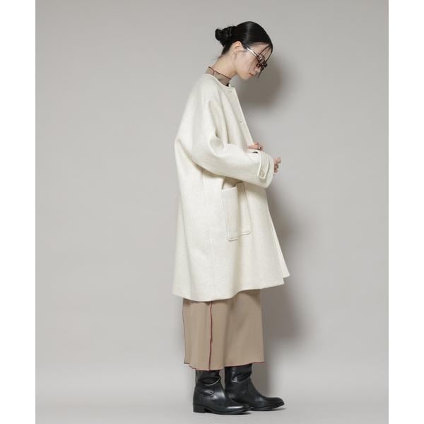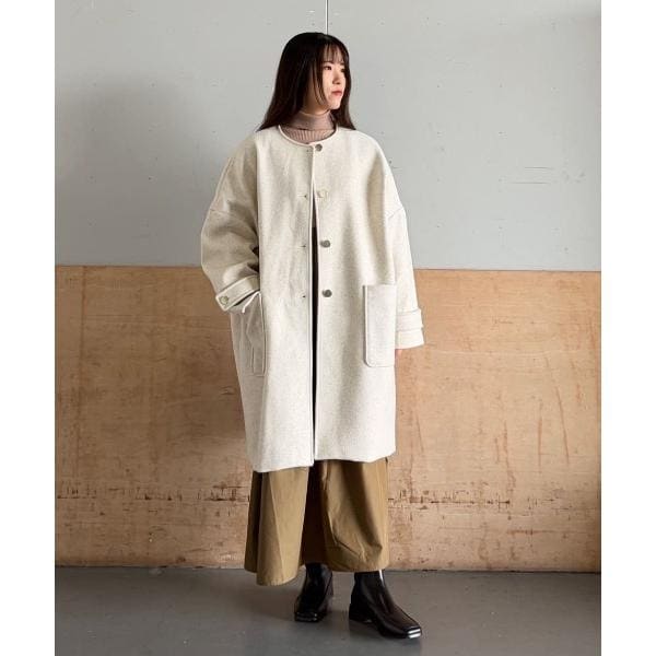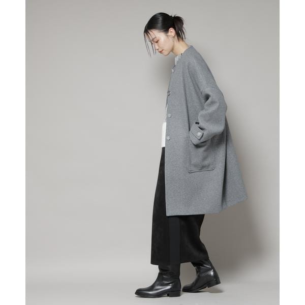 女性らしいシルエットのノーカラーコート。バランスが取りやすい上品な丈感で、ボリューム感のあるワイドパンツ等と合わせても着ぶくれしないアイテム。通勤やきちんとした場面でも活躍する万能なアウターです。