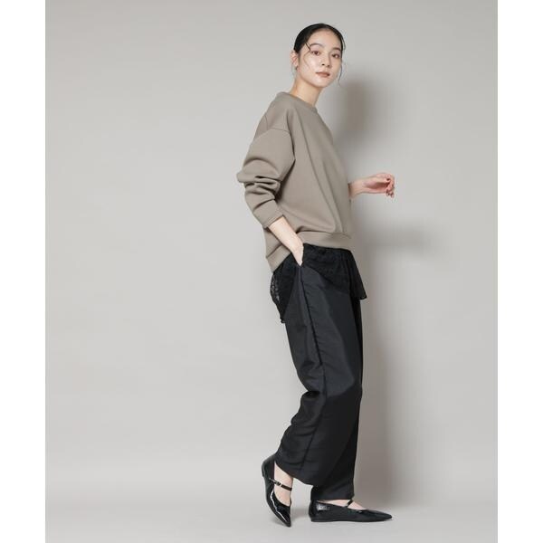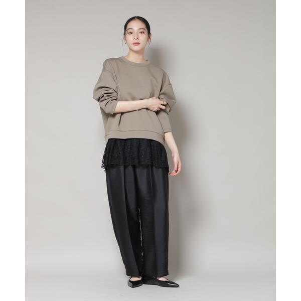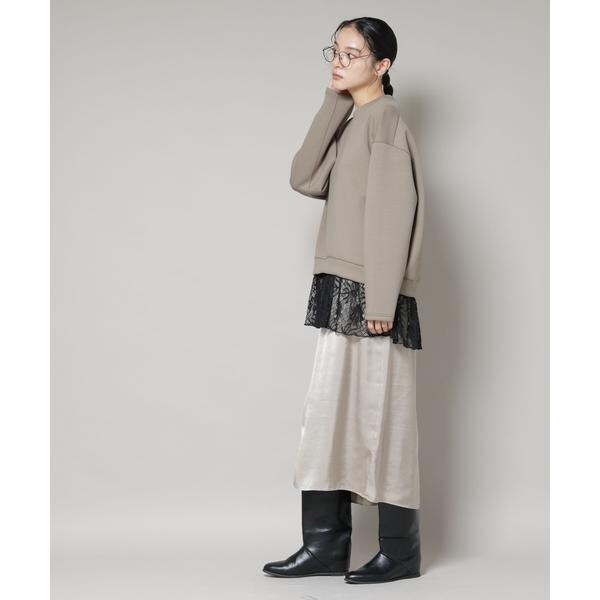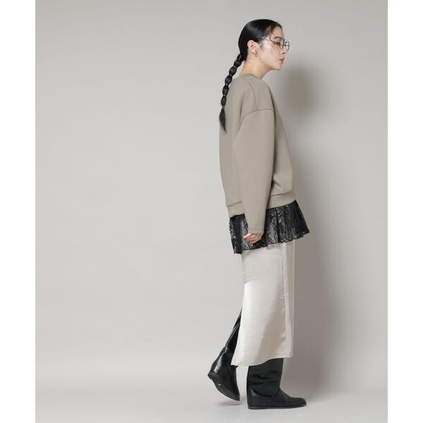 異素材トップスとキャミワンピースがセットになったレイヤード風ワンピース。膨らみのあるダンボール素材のトップスは丸みのある立体的なシルエットで、裾の繊細なレースがフェミニンさをプラス。一枚で簡単に旬のレイヤードスタイルが完成する便利なアイテムです。
