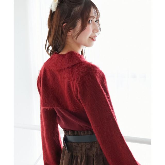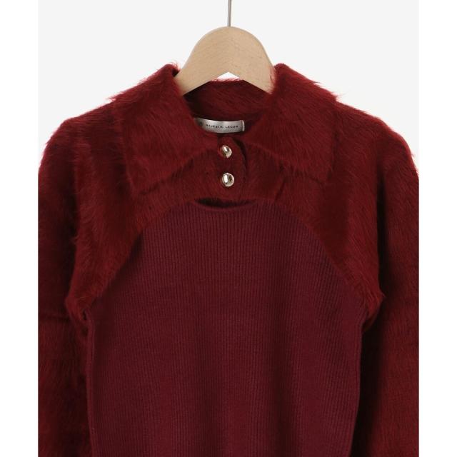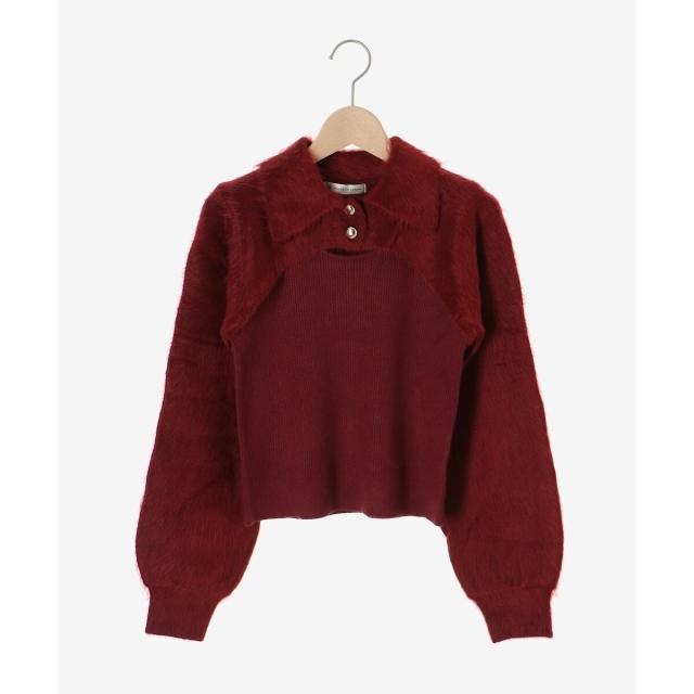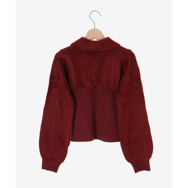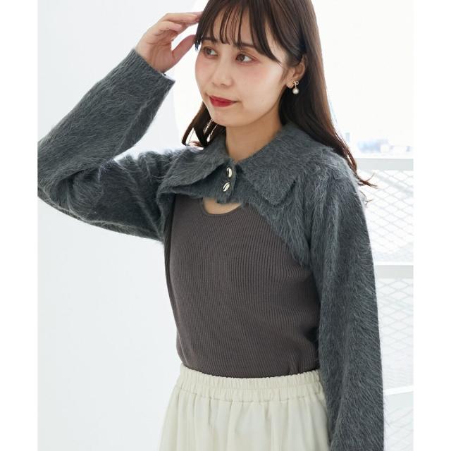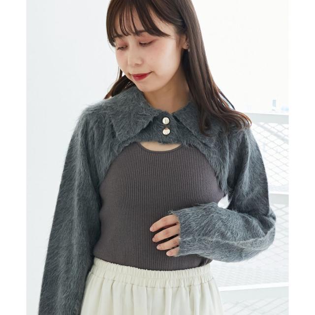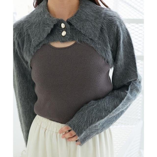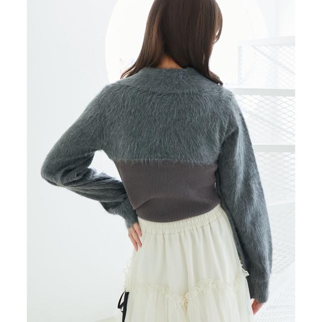 ボレロ部分はふわふわの糸を起毛させてシャギーに仕上げ、身頃部分はリブにすることでボディラインをすっきり見せ。