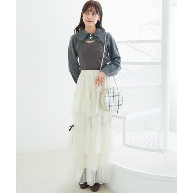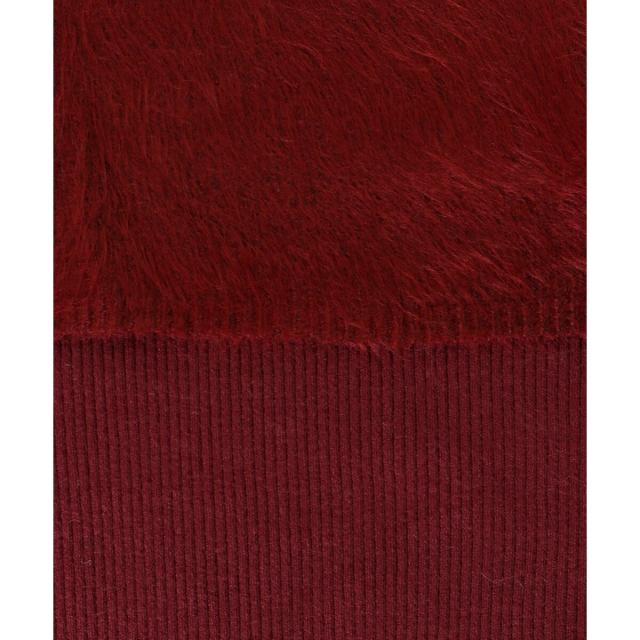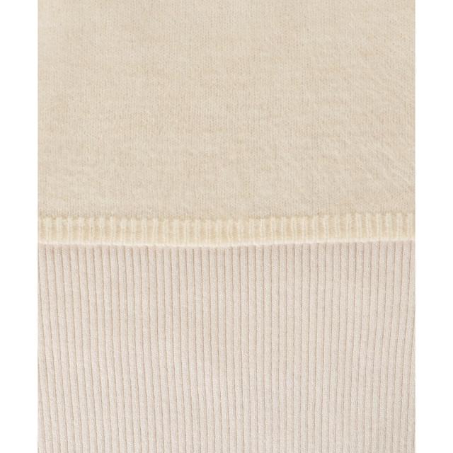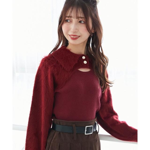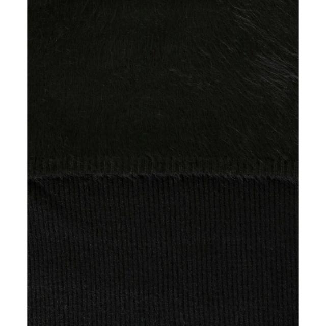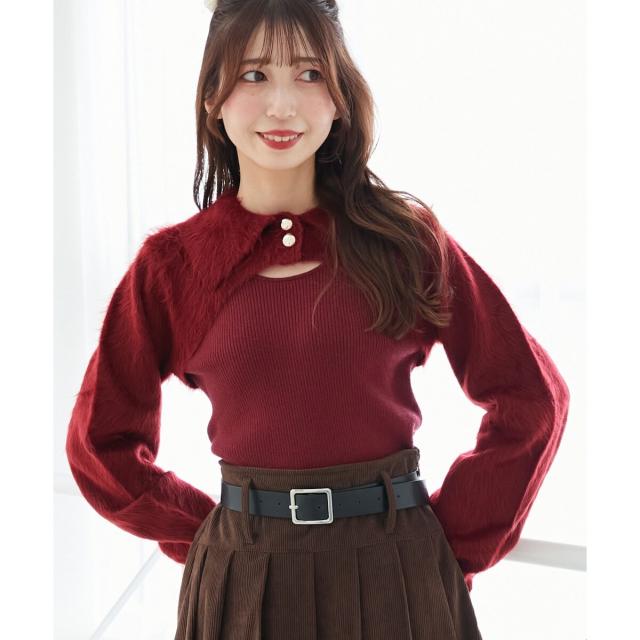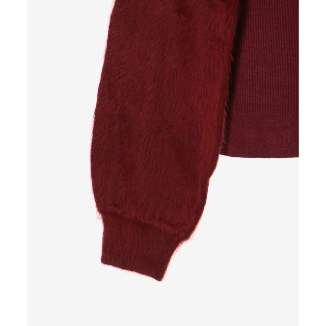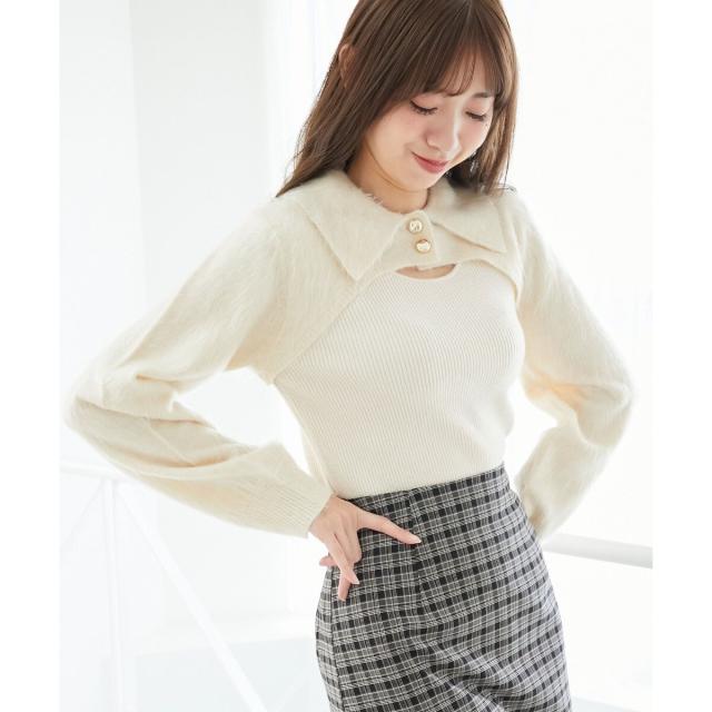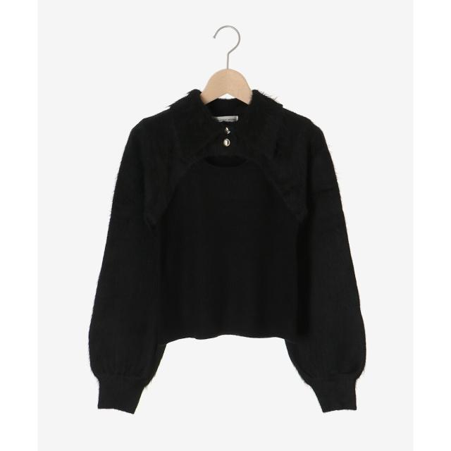 ボレロ部分はふわふわの糸を起毛させてシャギーに仕上げ、身頃部分はリブにすることでボディラインをすっきり見せ。