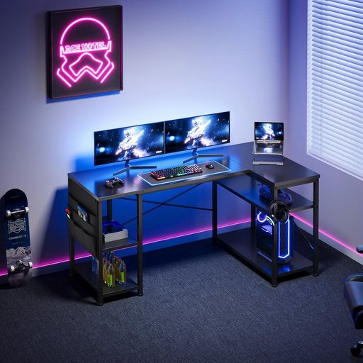YETOM ゲーミングデスク L字デスク机PCデスク幅130CM パソコンデスク勉強机学習机 左右入替可棚板高さ調節可能 収納袋付き オフィスデスク ワークデスク黒い