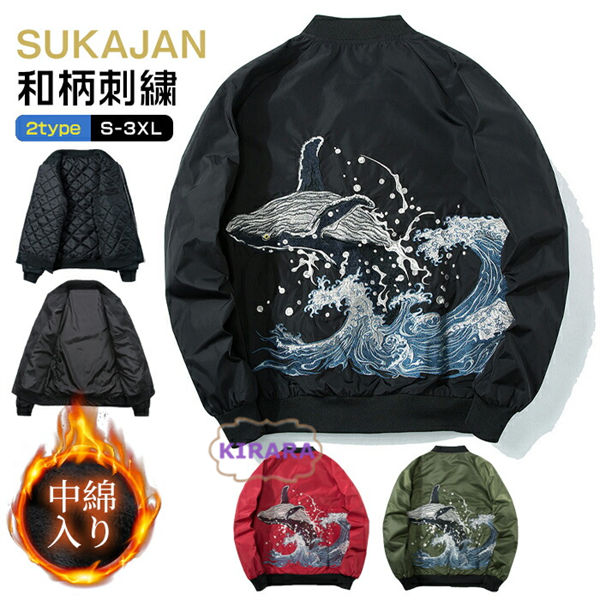 ライダースジャケット スカジャン メンズ フライトジャケット 和柄 秋服 中綿ジャケット カジュアルジャケット スタジアムジャンパー アウター ジャンバー 鯉 魚 刺繍 ブルゾン アウトドア 春 冬