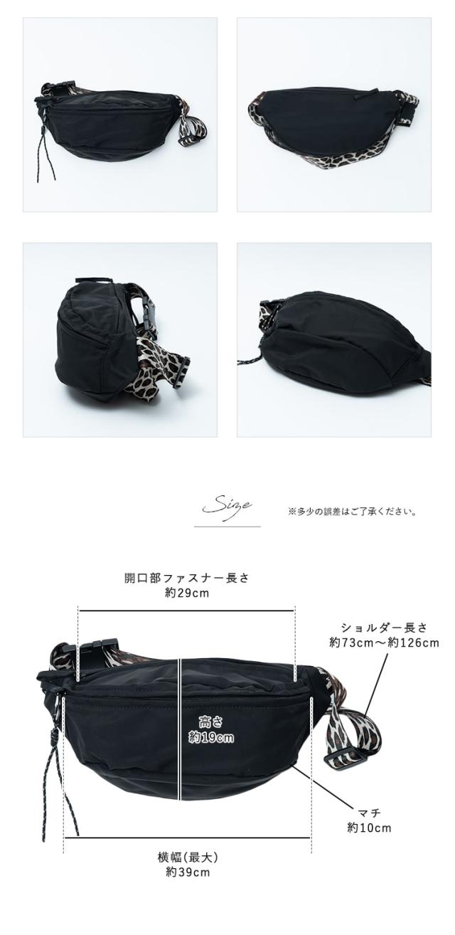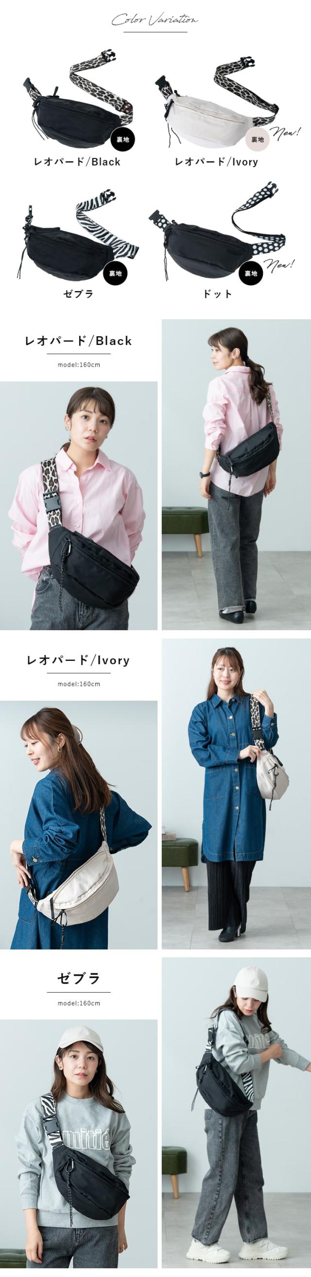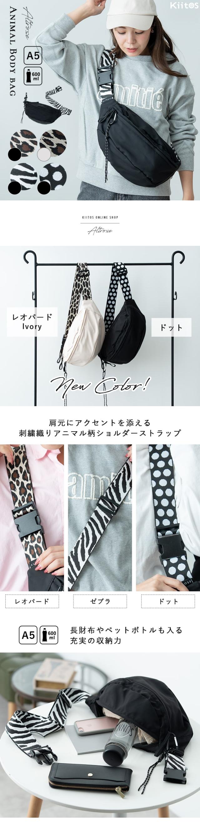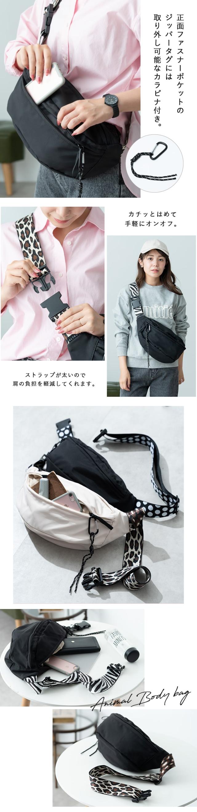 肩元にアクセントを添える、アニマル柄ショルダーストラップが印象的なボディバッグ。