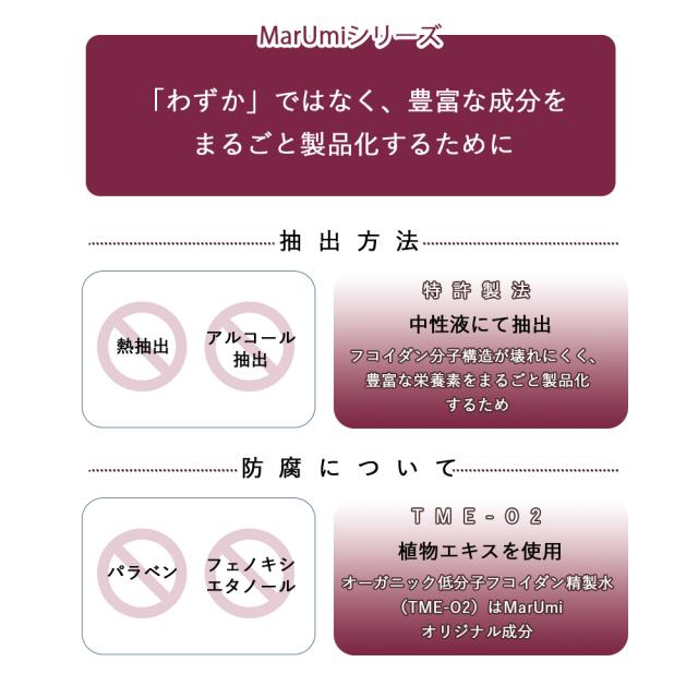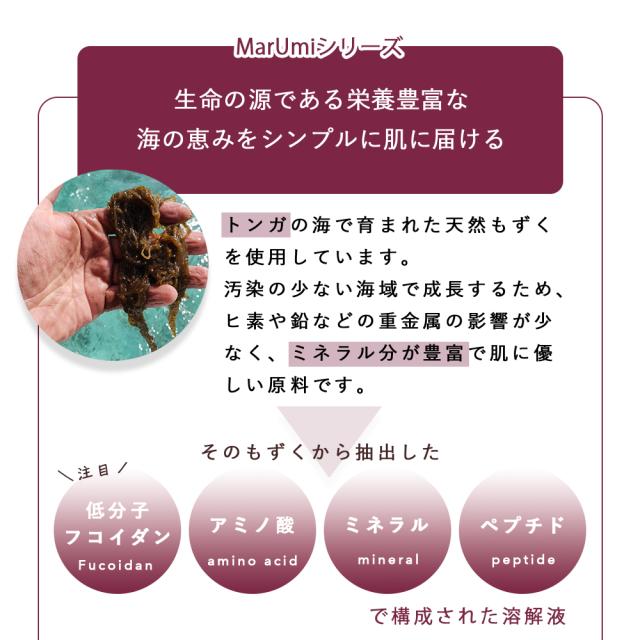 MarUmiフィトミンオイルは100%自然由来成分で出来ています。 生まれたての赤ちゃんからおじいちゃん、おばあちゃんまですべての方に安心してご使用いただける製品に仕上げています。 お顔やデリケートゾーンなど全身にご使用いただける万能オイルです。 メインオイルにはイスラエル産のゴールデンホホバを使用。 栽培から生産まで厳しい基準を満たしたエコサートコスモス、USDAの2つの認証を受けている非常にグレードの高いオーガニックオイル。プレス工程1回のみの一番搾りオイルにこだわり、自然のままの美しい色と香りが魅力です。 ビタミンなどお肌に有用な栄養が豊富に含まれています。 サブオイルには「モロッコの黄金」と呼ばれる希少なアルガンオイルを採用。 肌の美容に特効薬的な効果をもたらす脂肪酸の宝庫。それがアルガンオイルです。お肌の脂質と水分のバランスを整え、肌を保湿することに非常に優れています。また、肌細胞の血流を促進してくれるビタミンEも含まれています。 そしてMarUmiシリーズには欠かせない、 トンガ産天然モズクから抽出された高分子フコイダンが配合されています。 高分子フコイダン特有のヌメリ成分が刺激や雑菌からお肌を保護し、乾燥・アレルギー物質による刺激要因からお肌を守ります。 また、紫外線による弾力成分の劣化を防ぎ、ふっくらとしたお肌を維持します。 フィトミンオイルは天然精油のユーカリとラベンダーの香りを採用 香りだけではなく、ユーカリには肌のセラミド成分を増加させ、乾燥した皮膚を改善させる働きがあります。ラベンダーには肌の再生効果や炎症の改善効果も期待できます。 |