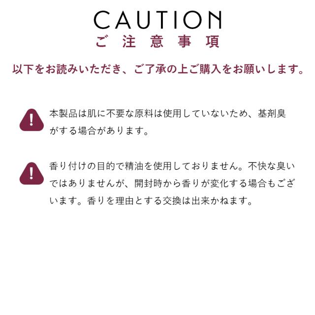 ・お肌に異常が生じていないかよく注意して使用してください。 化粧品がお肌に合わないとき即ち次のような場合には、使用を中止してください。 そのまま化粧品類の使用を続けますと、症状を悪化させることがありますので、皮膚科専門医等にご相談されることをおすすめします。 (1)使用中、赤み、はれ、かゆみ、刺激、色抜け(白斑等)や黒ずみ等の異常があらわれた場合 (2)使用したお肌に、直射日光があたって上記のような異常があらわれた場合。 ・目に入ったときは、直ちに洗い流してください。 ・傷やはれもの、しっしん等、異常のある部位にはお使いにならないでください。 |