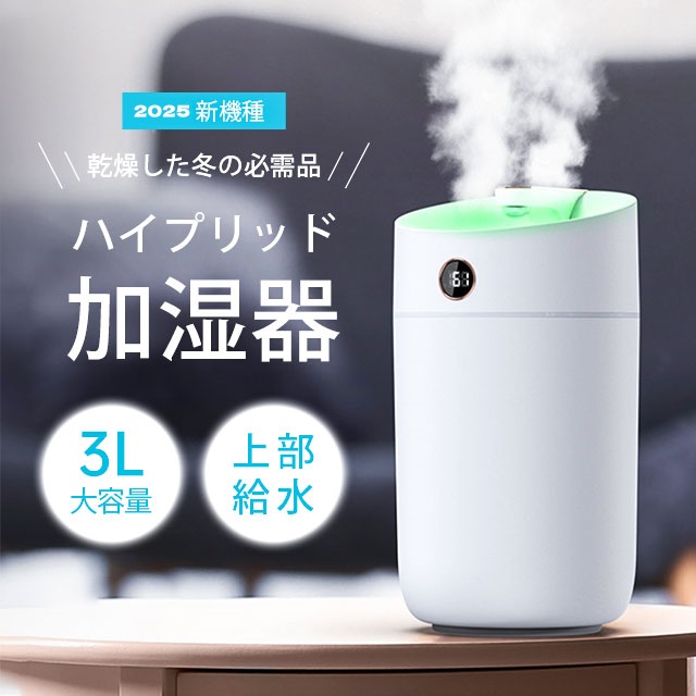 - 3L 卓上空気加湿機は加湿効果が高く,室内の乾燥を改善してくれます。