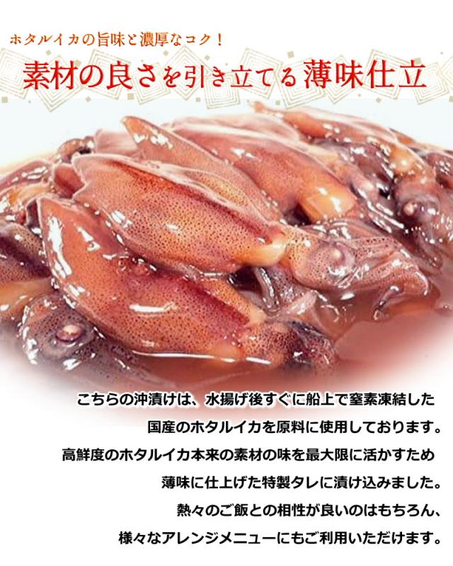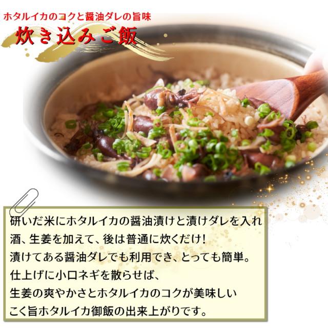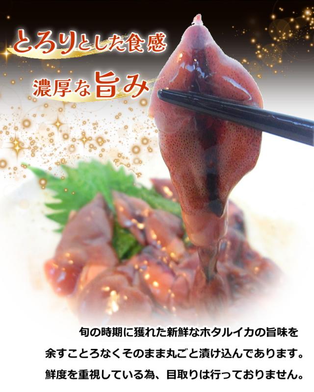 獲れたての新鮮なほたるいかを、吟味を重ねた調味液に漬け込んだ商品です。